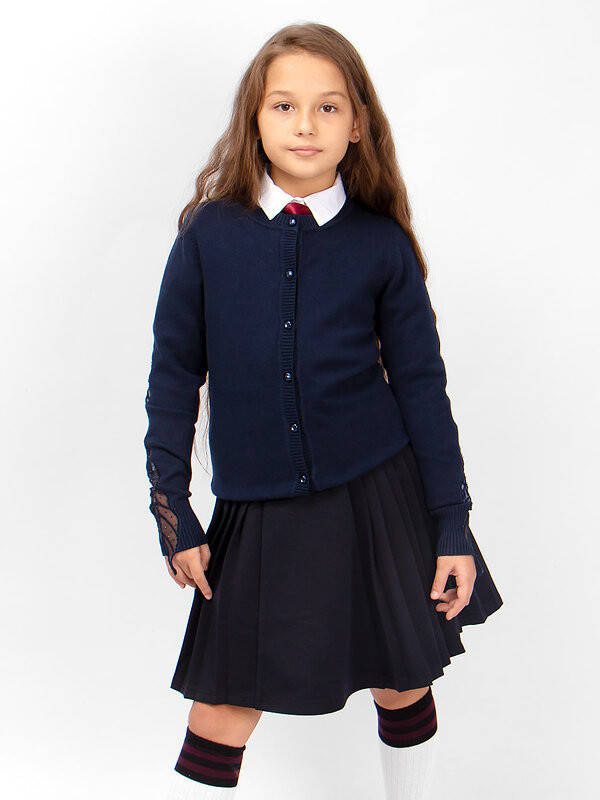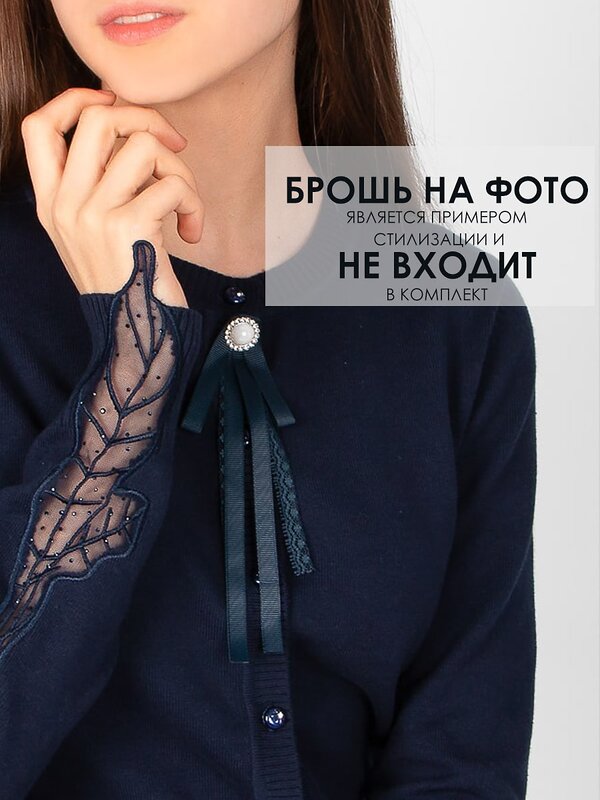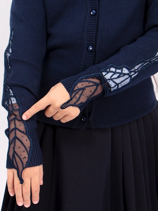 Изысканный кардиган на пуговицах. На рукавах прозрачные вставки из фатина, украшенные вышивкой и стразами. Мягкий, вязаный трикотаж не сковывает движений, обладает хорошей воздухопроницаемостью и приятно облегает тело. Кардиган прекрасно сочетается как с юбками, так и с брюками. Подойдет для посещения школы, официального или праздничного мероприятия.