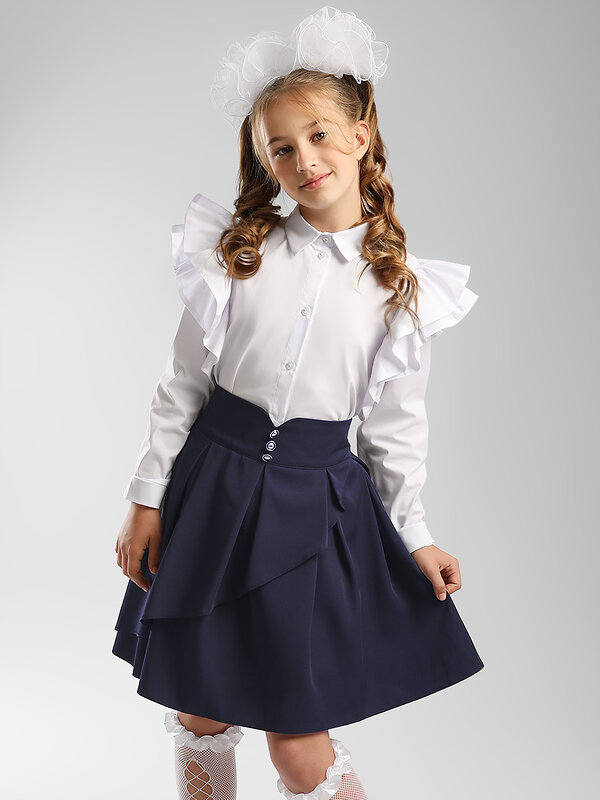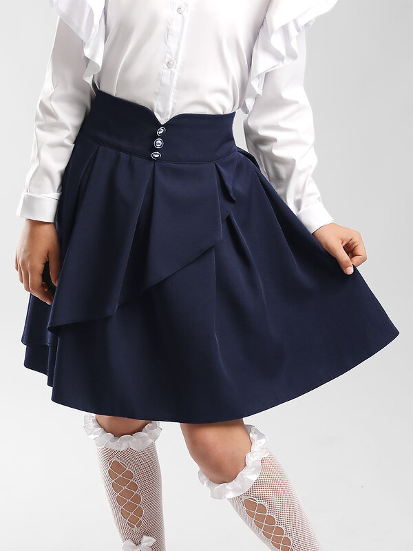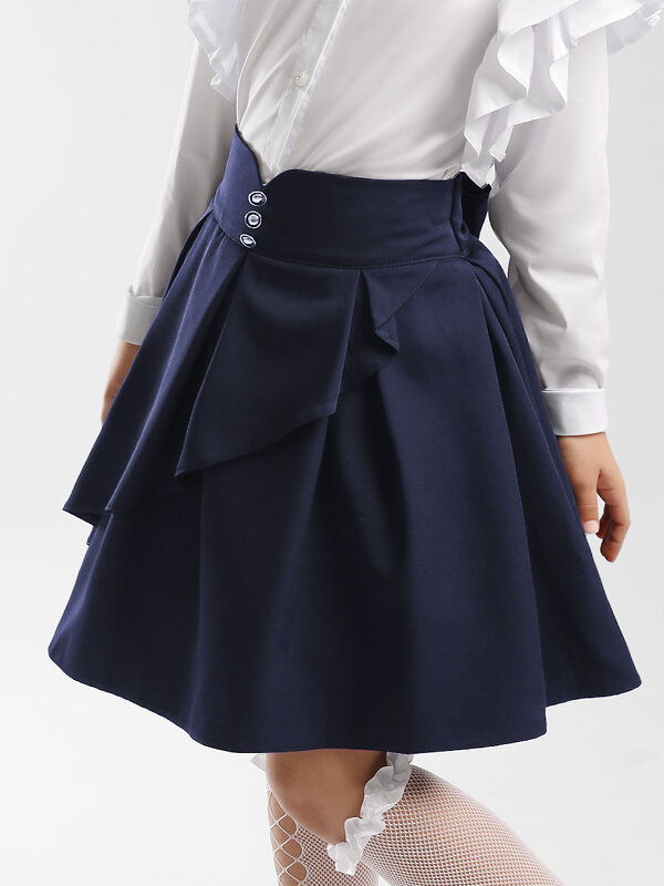 Юбка для девочки Соль&Перец выполнена из качественного габардина, который состоит из 80% полиэстера и 20% вискозы. Такая ткань отлично держит форму и устойчива к сминанию, что особенно важно для школьной одежды. Модель оснащена удобным широким поясом-резинкой, который обеспечивает комфортную посадку по фигуре. Юбка украшена воланом и лентами-завязками, выполненными из основной ткани. Это придаёт модели нарядный и женственный вид, при этом сохраняя строгость, необходимую для школьной формы.