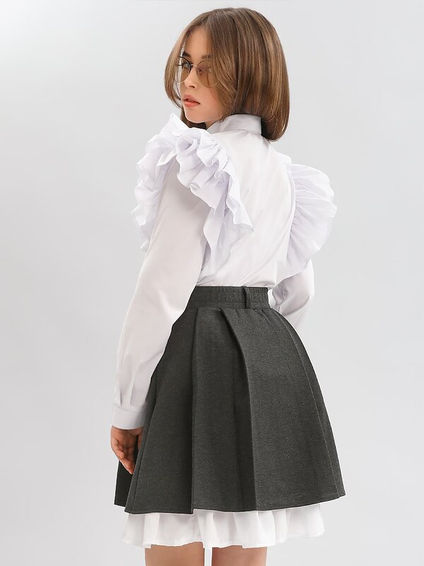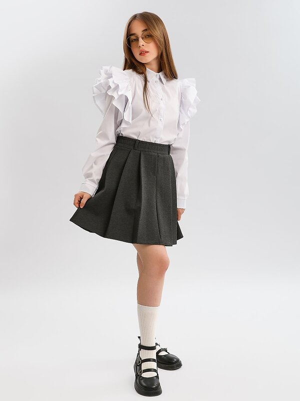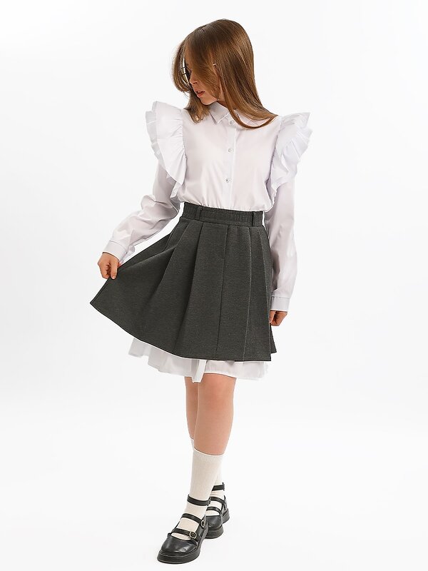 Юбка для девочки Соль&Перец выполнена из качественной костюмной ткани, которая отлично держит форму и устойчива к сминанию, что особенно важно для школьной одежды. Модель оснащена удобным широким поясом-резинкой, который обеспечивает комфортную посадку по фигуре. Юбка дополнена съёмным подъюбником, выполненным из хлопка. Это придаёт модели нарядный и женственный вид, при этом сохраняя строгость, необходимую для школьной формы.
