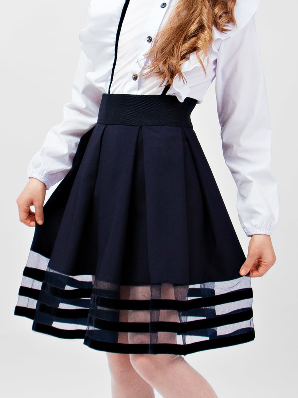 Юбка для девочки СольПерец в классическом стиле, с фатиновыми вставками. Модель с удобным широким поясом - резинкой, сзади застегивается на молнию. Безупречно сочетается с любой блузкой и идеально вольется в современный школьный гардероб. Цвет: темно-синий;черный; Материал: габардин;габардин; Состав: 70% полиэстер, 30% вискоза.