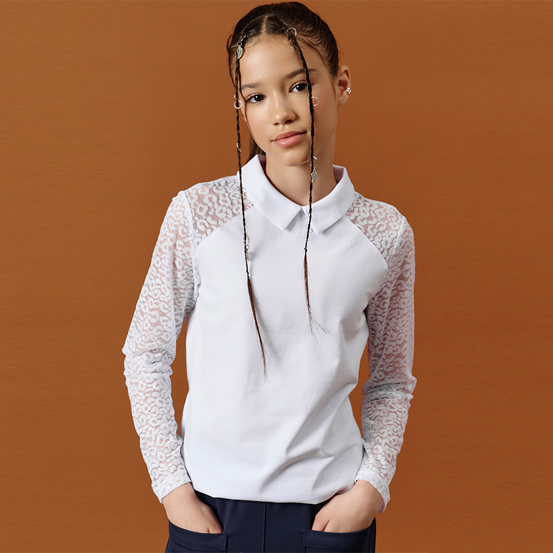Состав: 93%хлопок 7%эластан, вставка: 90%полиамид 10%эластанОписание: Ищете стильную и удобную блузку для школы, которая сочетает в себе комфорт и элегантность? Эта модель из мягкого эластичного хлопкового трикотажа — отличный выбор для вашей девочки. Наклонные кружевные вставки на плечах и длинные облегающие рукава из нежного эластичного кружева придают блузке изящный и современный вид, при этом кружево мягкое и не раздражает кожу, поэтому ребёнку будет удобно в блузке целый день Воротник выполнен в стиле классической рубашки с цельной стойкой и аккуратными заострёнными концами из основного материала, что делает образ опрятным и подходит под школьные требования к форме. Для удобства надевания на спинке сделан небольшой аккуратный разрез, а застёжка на две пуговицы помогает легко надевать блузку через голову. Блузка отлично сочетается с юбками, брюками и сарафанами, подходит как для ежедневных занятий в школе, так и для торжественных мероприятий. Материал легко стирается и быстро сохнет, что позволяет экономить время на уходе и сохранять свежий вид даже после многократных стирок. Выбирая эту блузку, вы обеспечиваете своей дочери комфорт, удобство и стильный внешний вид — всё, что нужно для успешного и уверенного школьного дня! Используйте таблицу размеров на фотографии, чтобы выбрать подходящий размер. Обратите внимание, что цвет товара на экране вашего устройства может отличаться от реального.