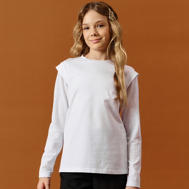 Состав: 93%хлопок 7%эластан, вставка: 83%полиамид 17%эластанОписание: Этот лонгслив станет настоящей находкой для гардероба школьницы! Выполнен из приятного к телу хлопкового трикотажа с добавлением эластана — материал дышащий, мягкий и слегка тянется, обеспечивая комфорт в течение всего дня. Особенности дизайна: Длинные рукава из нежного кружева с рельефным горизонтальным узором придают образу лёгкость и утончённость. Кружево абсолютно не колется и не раздражает кожу, благодаря качественному материалу и продуманной обработке швов. Полуприлегающий силуэт красиво садится по фигуре, не стесняя движений. Эффектные крылышки на плечах из основной ткани добавляют нарядности и игривого настроения. Удобство и универсальность: Идеален для школы, праздников, фотосессий или семейных встреч. Легко сочетается с юбками, брюками и сарафанами. Прост в уходе: не требует особых условий при стирке, сохраняет форму и внешний вид после многократного использования. Этот лонгслив — отличный выбор для тех, кто ценит комфорт и хочет выглядеть красиво каждый день. Используйте таблицу размеров на фотографии, чтобы выбрать подходящий размер. Обратите внимание, что цвет товара на экране вашего устройства может отличаться от реального.