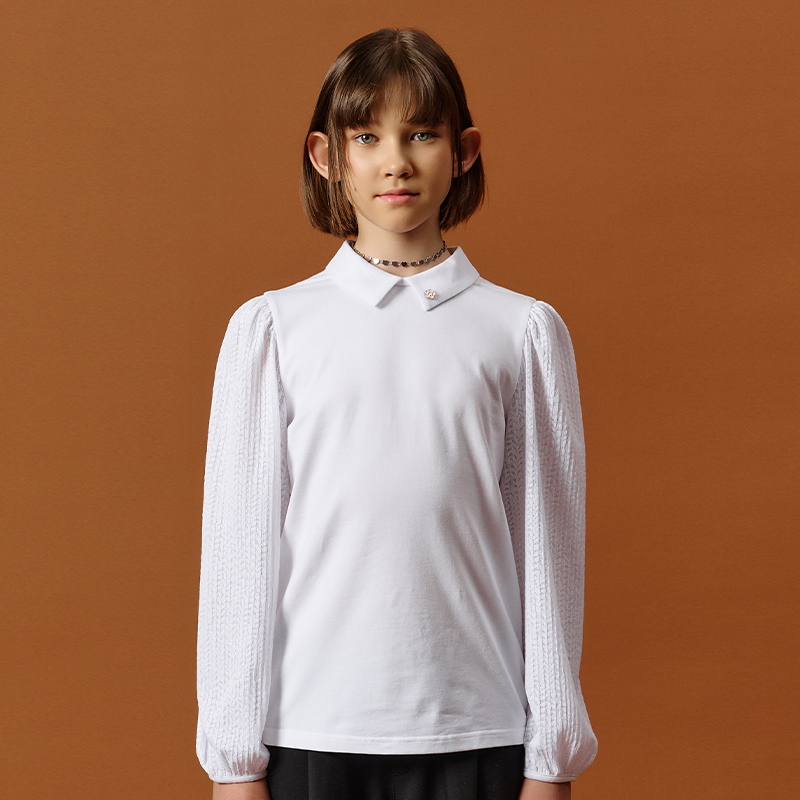 Состав: 93%хлопок 7%эластан, вставка: 83%полиамид 17%эластанОписание: Школьная блузка для девочки с кружевными рукавами, воротником и съёмным пином — комфорт и стиль на каждый день Эта трикотажная блузка для школы сочетает в себе удобство, аккуратный внешний вид и оригинальные детали. Модель выполнена из мягкого хлопкового материала с добавлением эластана — ткань дышит, приятно ощущается на теле и не сковывает движений. Полуприлегающий силуэт и эластичная структура делают блузку комфортной для повседневной носки в школе. Длинные кружевные рукава с гофрированным эффектом придают образу лёгкость и индивидуальность. Сборка по верху и низу добавляет объёма, а аккуратная отделка манжет тканью в тон делает рукава удобными и не раздражающими кожу. Отложной воротничок добавляет строгости и хорошо смотрится под сарафан, пиджак или жилет. Сзади — разрез и застёжка на две пуговицы с мягкими резиновыми петельками — легко надевать и снимать, особенно для младших школьниц. Изюминка модели — съёмный пин в виде весёлого цветочка с глазками и улыбкой. Он добавляет игривое настроение и делает образ менее формальным. Такой аксессуар понравится детям, ведь его можно снять или прикрепить по настроению. Это делает блузку не только школьной, но и подходящей для прогулок, походов в кружки или встреч с друзьями. Идеальна для 1–9 классов, подходит к любой школьной форме: юбкам, брюкам, сарафанам. Используйте таблицу размеров на фотографии, чтобы выбрать подходящий размер. Обратите внимание, что цвет товара на экране вашего устройства может отличаться от реального.