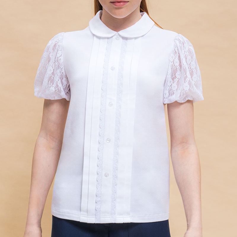 Состав: 93%хлопок 7%эластан, вставка: 90%полиамид 10%эластанОписание: Школьная блузка с объёмными рукавами и отложным воротником для девочки. Комфортная и мягкая трикотажная блузка умеренного объёма хорошо садится на девочек с разной фигурой и не сковывает движений ребёнка. При этом визуально модель максимально приближена к классической блузке из швейной ткани: по центру переда декоративная фальш-планка с нашитыми пуговицами, вдоль планки застрочены вертикальные складки и кружево с фигурным краем. Рукава выполнены из оригинального кружевного эластичного полотна с нежным девичьим узором. На спинке под воротником удобная застёжка на две пуговицы. В составе ткани преобладает высококачественый хлопок — ребёнку не жарко, кожа дышит. Благодаря полиамиду блузка в школу для девочки хорошо сохраняет форму и первоначальный внешний вид. Модель однотонная, без принта. В ассортименте представлены блузки для девочек школьные универсальных цветов. Они легко сочетаются с различными брюками, юбками, сарафанами. Блузка детская подходит как для повседневной носки в школу, так и для более торжественного случая — в зависимости от того, с чем её надеть. Отличный выбор школьной формы для вашей девочки. Помните о правильном уходе за изделием: рекомендуется стирать при температуре не выше 30 °C, без предварительного замачивания, с изнанки. Это поможет сохранить качество и цвет блузки на долгое время. Не забывайте о выборе правильного размера. Используйте таблицу размеров на фотографии, чтобы выбрать подходящий вариант. Обратите внимание, что цвет товара на экране вашего устройства может отличаться от реального.
