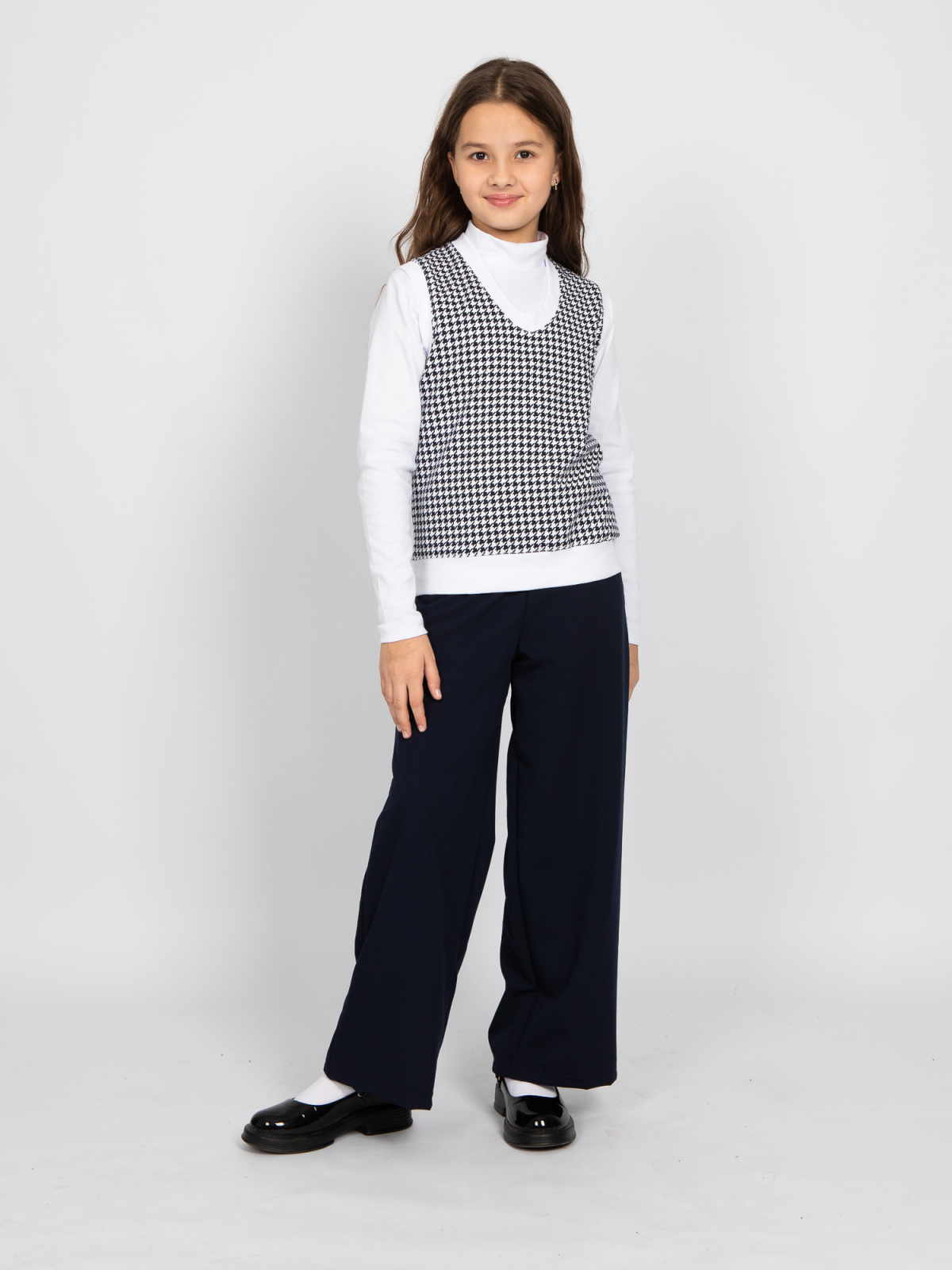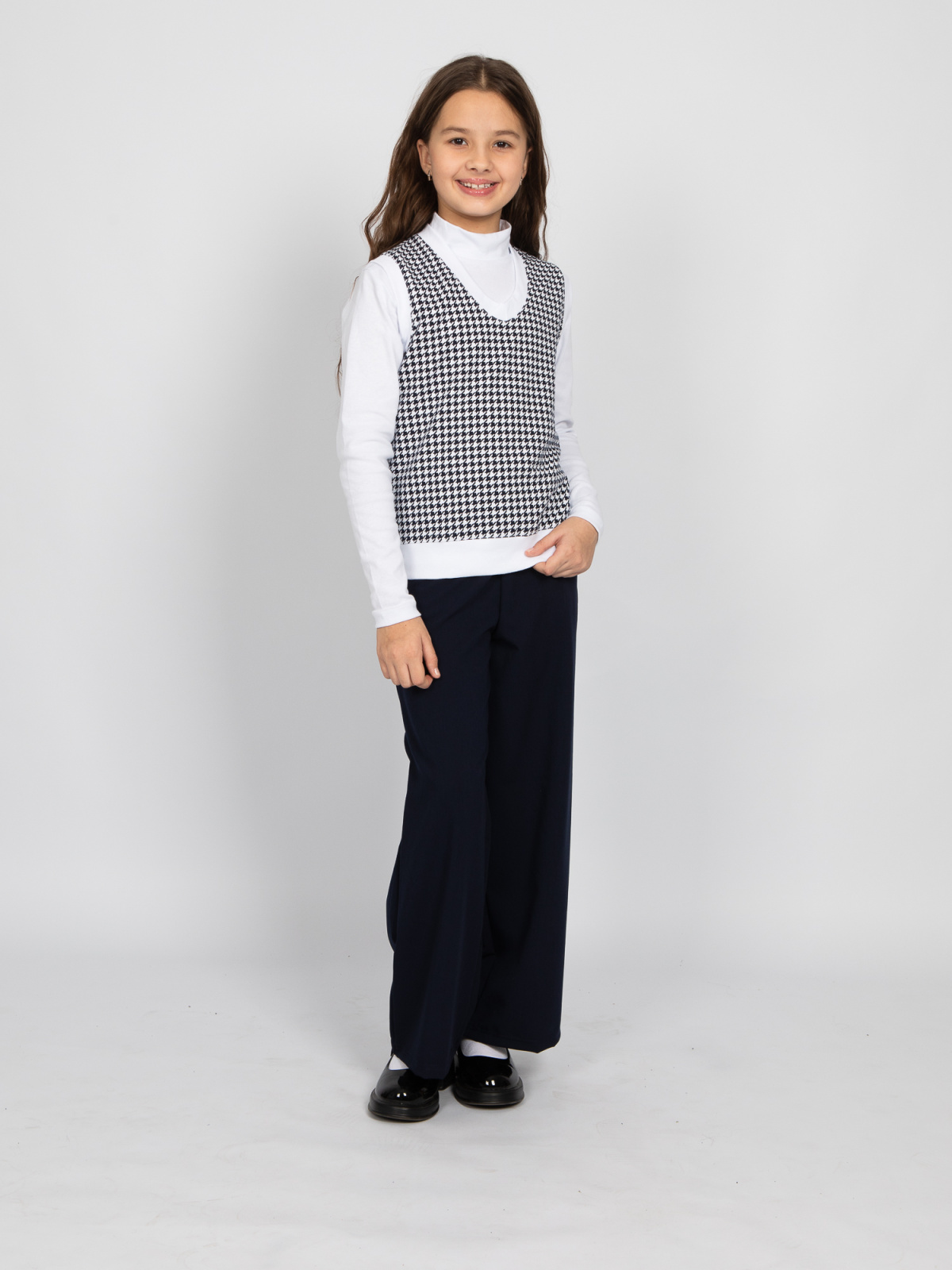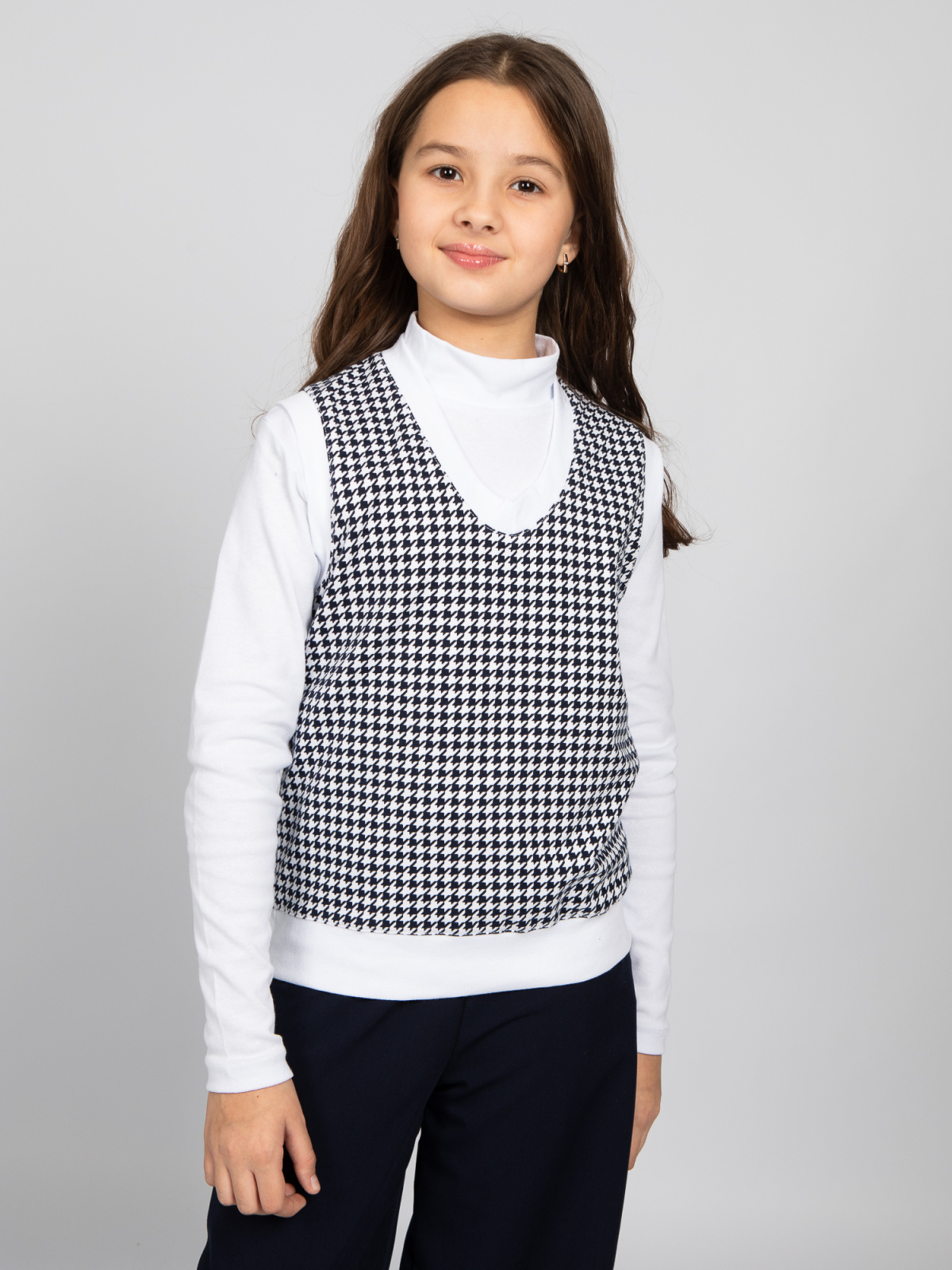 Модный подростковый жилет для девочки из трикотажного полотна с принтом «гусиная лапка». Горловина с V-образным вырезом. Отделка горловины, рукава и резинки пояса контрастной белой тканью. Модель выполнена в классическом стиле, хорошо подчеркивает фигуру и собирает цельный образ. Отличная модель для комбинирования модных образов. Здорово смотрится в комбинации с однотонной водолазкой, рубашкой, джемпером, лонгсливом и т.п., под брюки, кюлоты, джинсы, юбку или платье. Жилетка - отличный вариант для школы и повседневной жизни, не сковывает движения, сядет на любую фигуру, станет дополнительным утеплением для девочки - подростка. Демисезонный жилет не теряет форму после стирки, не вытягивается, резинка не давит, его легко надевать и снимать. Яркий контрастный элемент гардероба для современной модницы. Жилет подростковый, жилет для девочки подростка, жилет детский в клетку «гусиная лапка», жилет трикотажный для девочки черно-белый, жилет трикотажный подростковый для девочки. Размерный ряд 140, 146, 152, 158, 164
