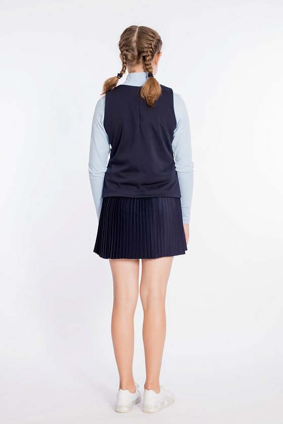 Стильный трикотажный жилет, незаменимый вариант школьной одежды на каждый день. Жилет выполнен из академика. V-образный вырез горловины, спереди застёжка на пуговицы и два накладных кармана.