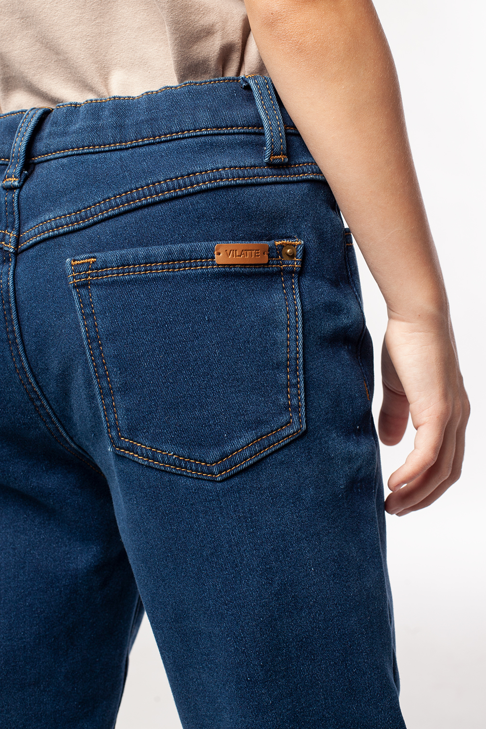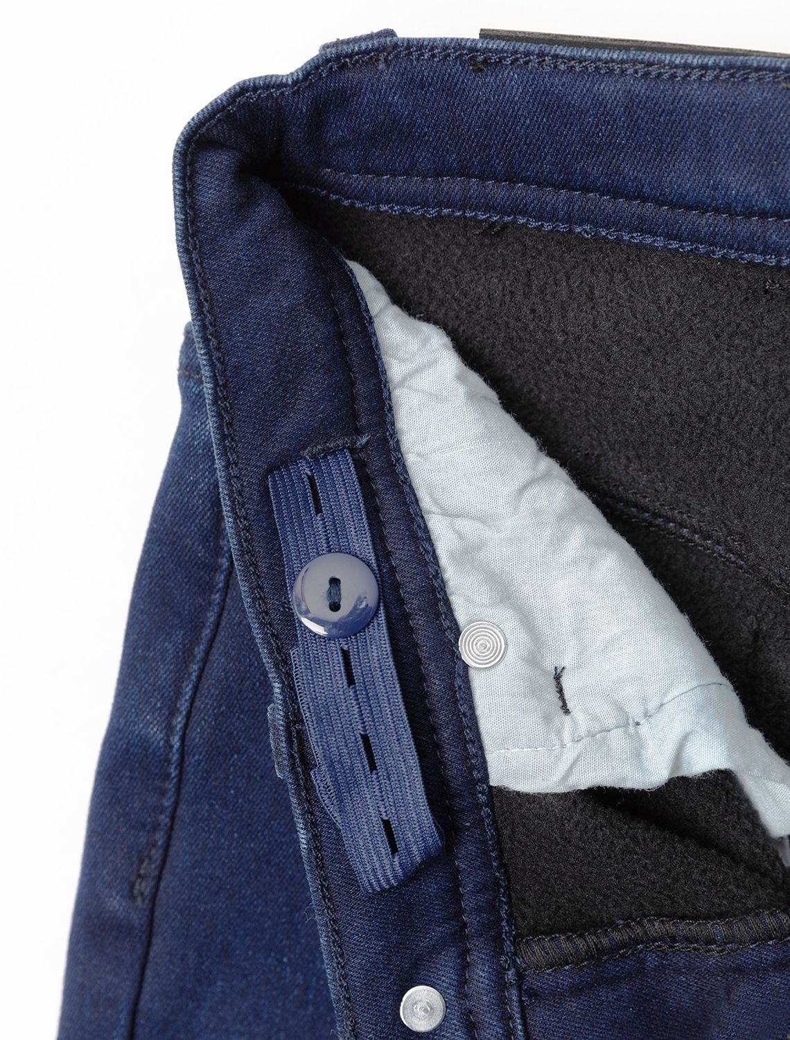 Синие джинсы выполнены из эластичного денима. Внутренняя сторона джинс из мягкого флиса, обеспечит тепло и комфорт на целый день. Есть дополнительная фиксация талии при помощи внутренней резинки. Изделие дополнено высококачественной металлической фурнитурой с логотипом бренда.