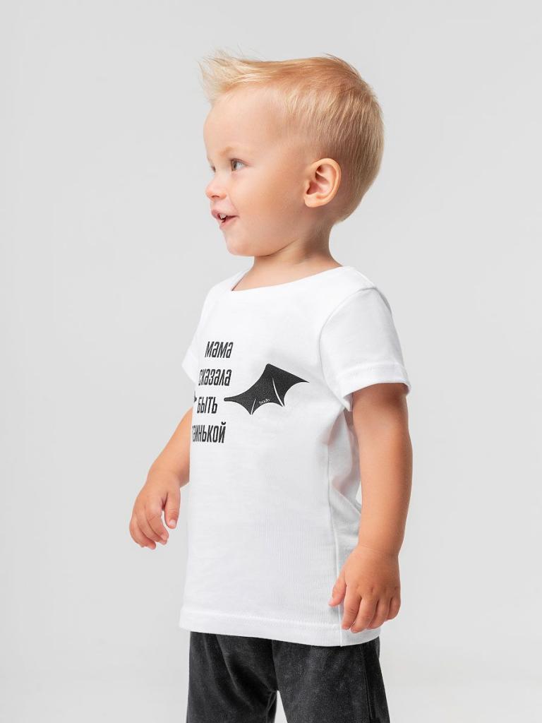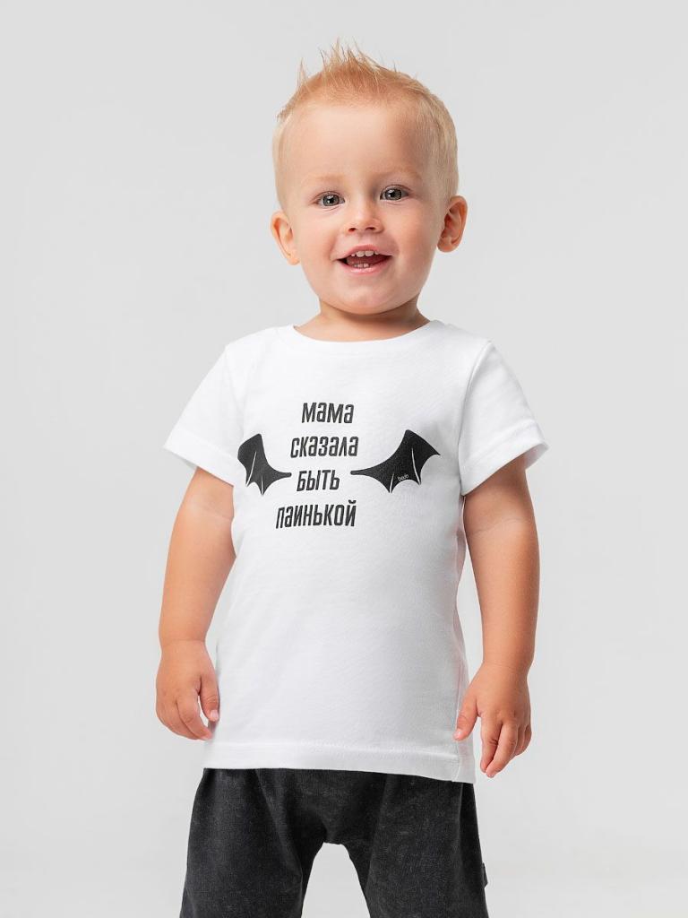 Артикул 54-22MU Материал кулирная гладь Состав 100% хлопок Футболка прямого силуэта с короткими рукавами. Горловина округлой формы. На полочке располагается принт "Мама сказала быть паинькой"