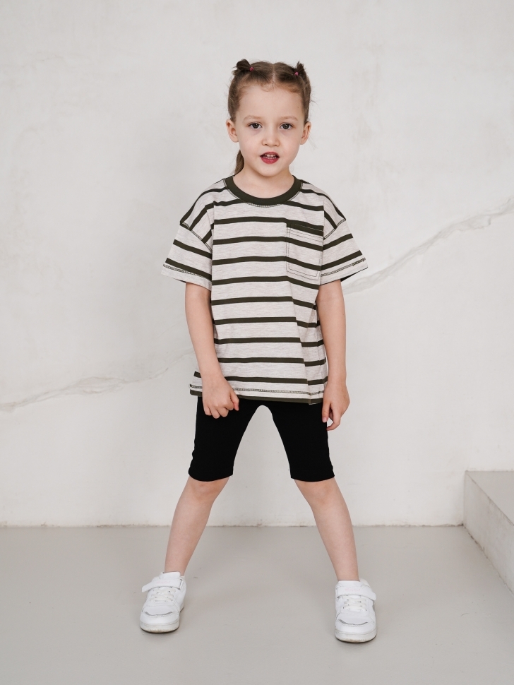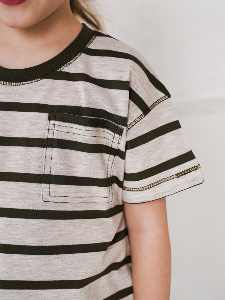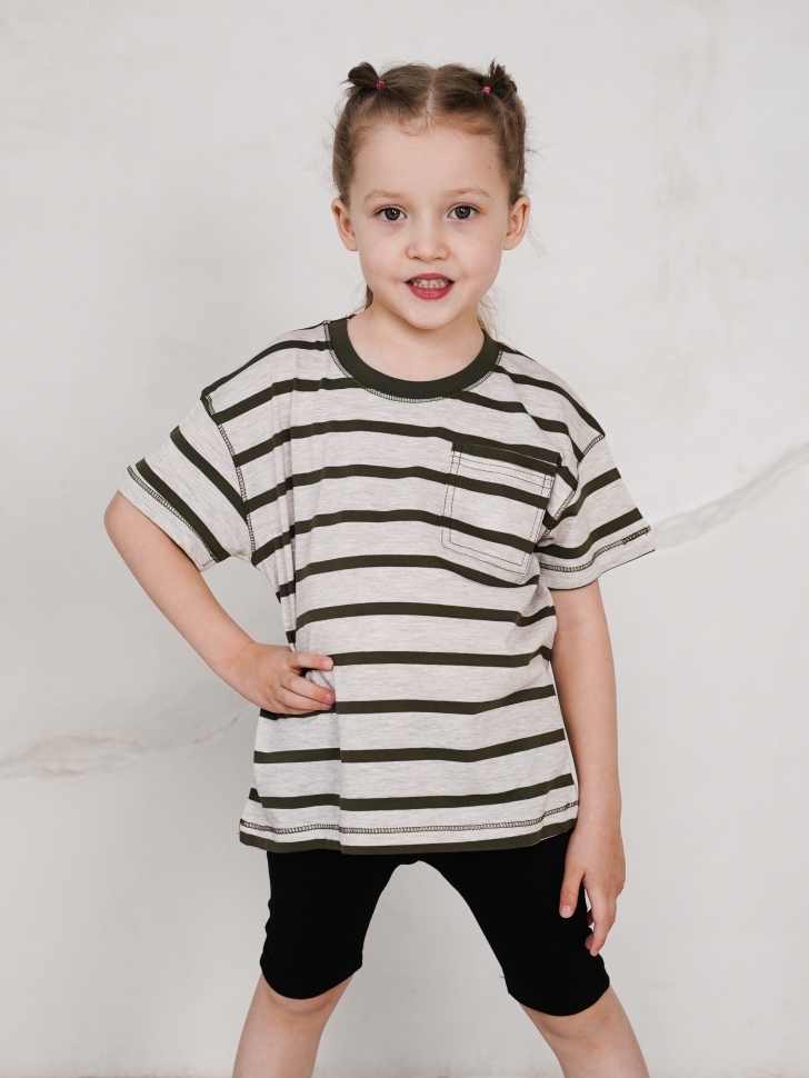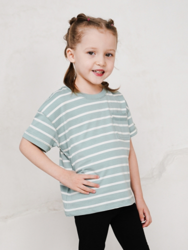 Футболка прямого свободного силуэта с короткими рукавами. Круглая горловина обработана широкой обтачкой в цвет полоски основы. Накладной карман на полочке «как у взрослых».