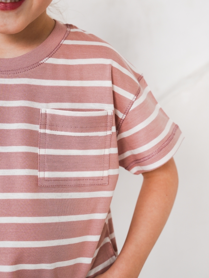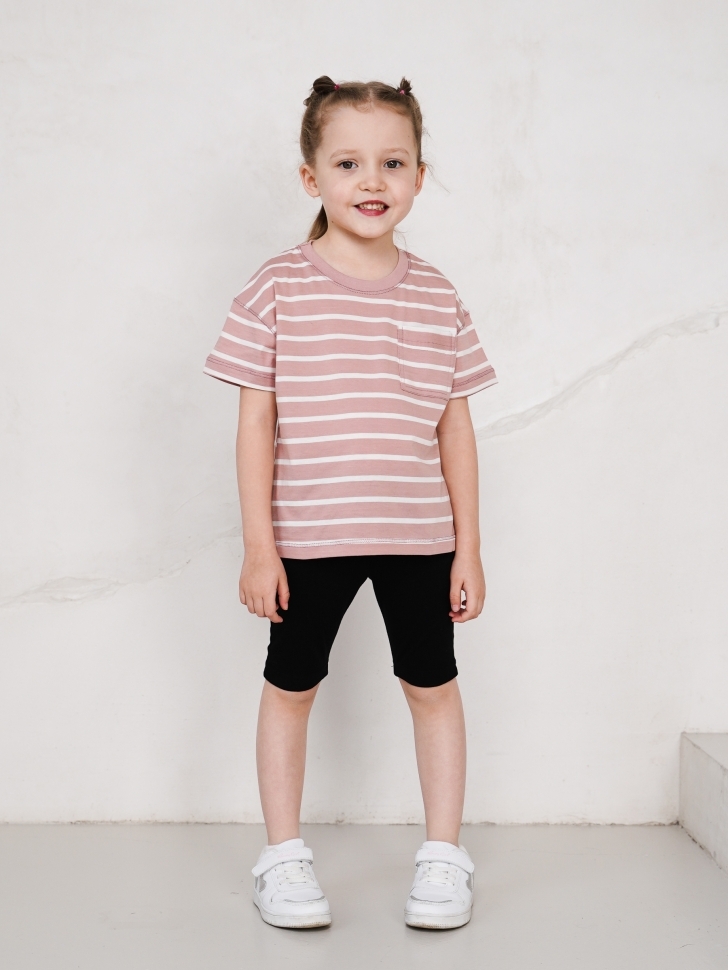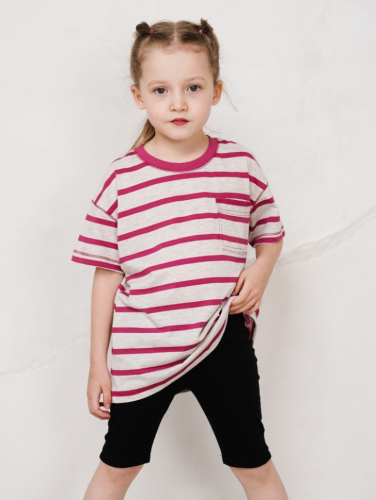 Футболка прямого свободного силуэта с короткими рукавами. Круглая горловина обработана широкой обтачкой в цвет полоски основы. Накладной карман на полочке «как у взрослых».