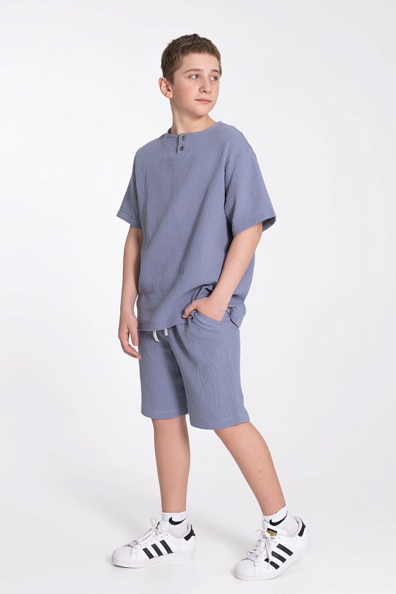 Футболка выполнена из хлопкового полотна - муслина. Силуэт  свободный, круглый вырез горловины украшен двумя пуговицами.