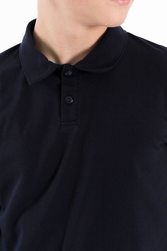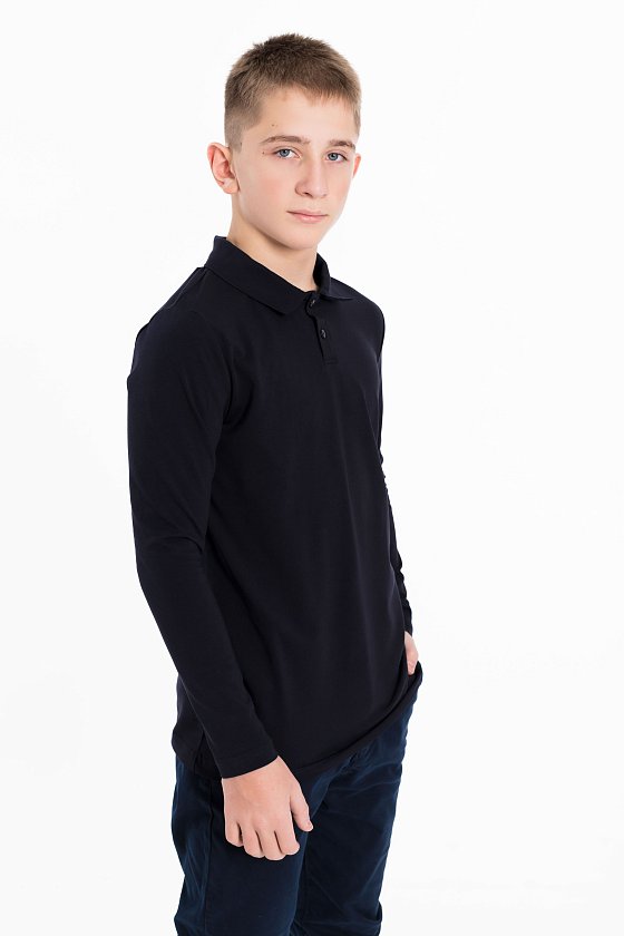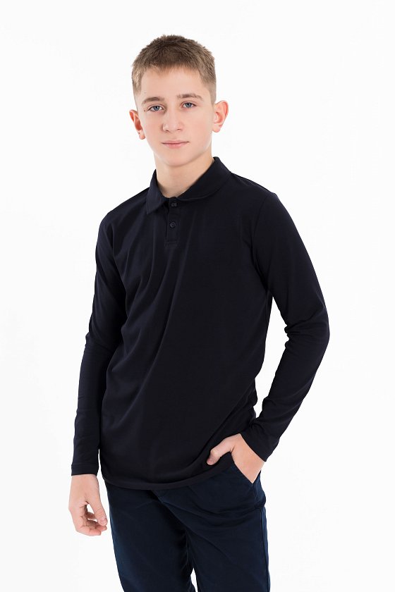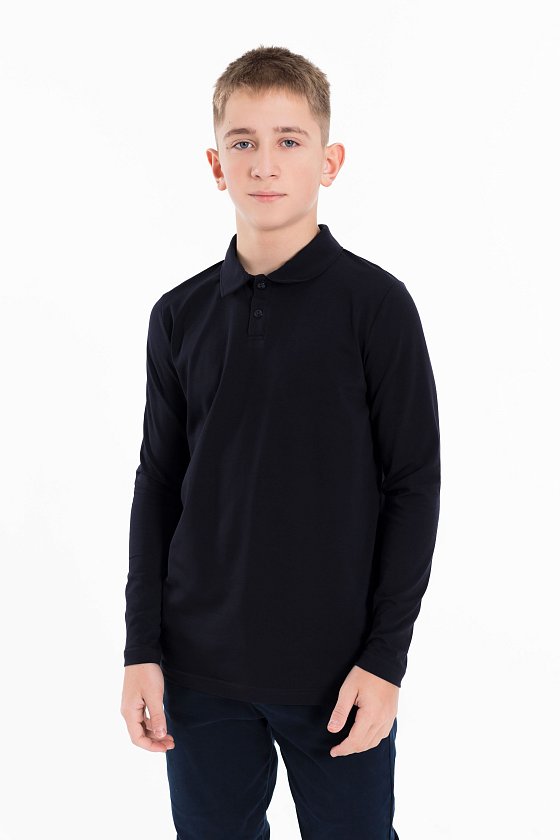 Синяя футболка-поло с длинным рукавом из материала кулирка с лайкрой и застёжкой на две пуговицы — отличный выбор для школьника. Обеспечивает свободу движений, комфорт и аккуратный внешний вид. Воротник придаёт изделию стильный вид.