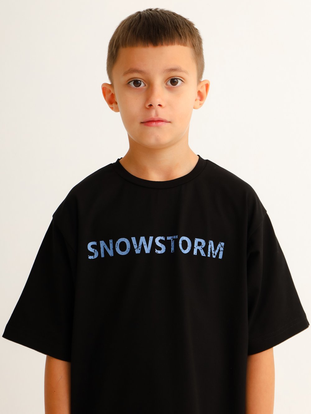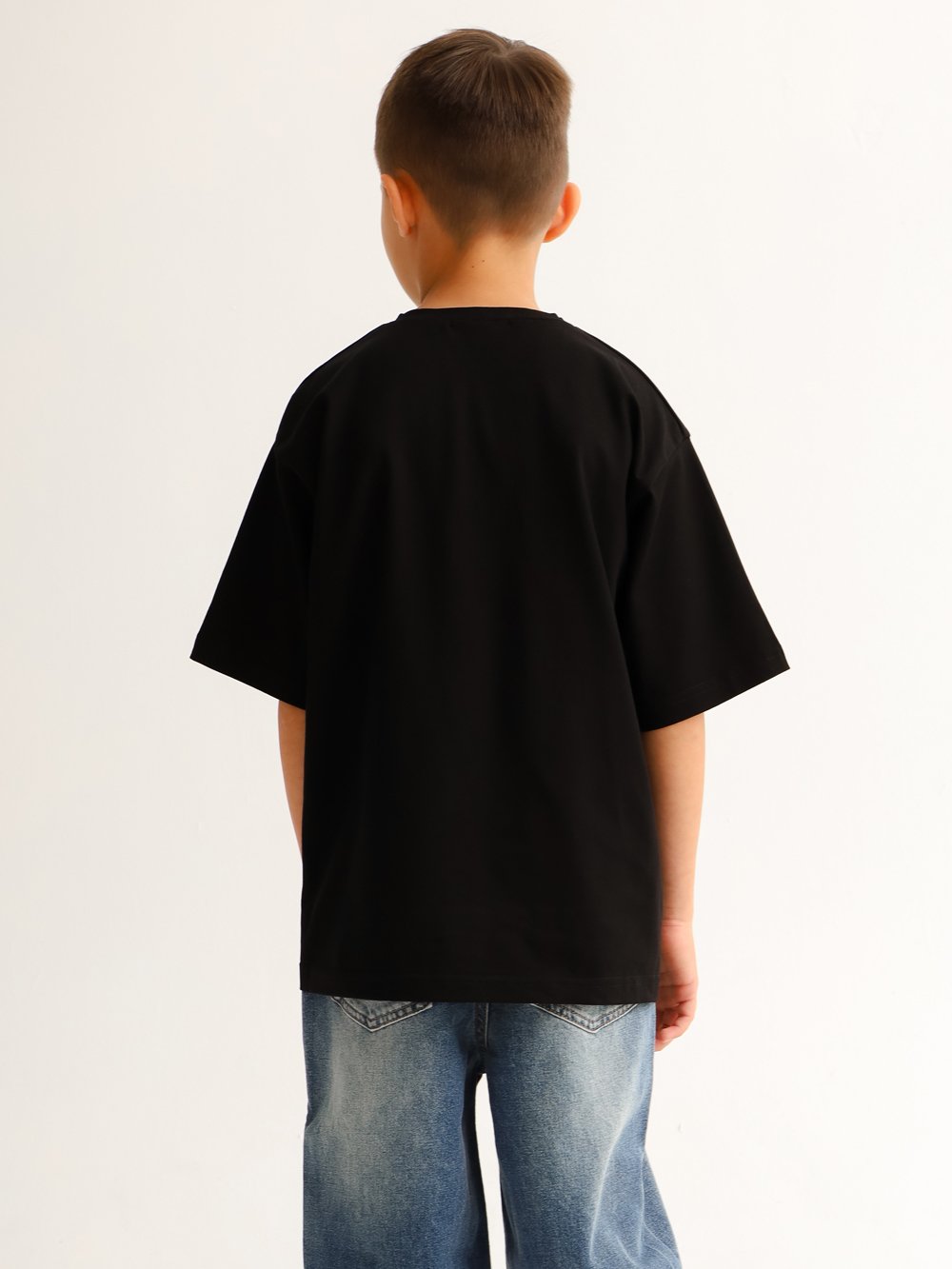Футболка свободного силуэта с округлым вырезом горловины с обтачкой из рибаны. Удлиненный рукав, принт на полочке.