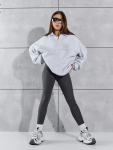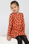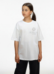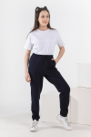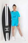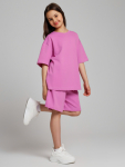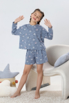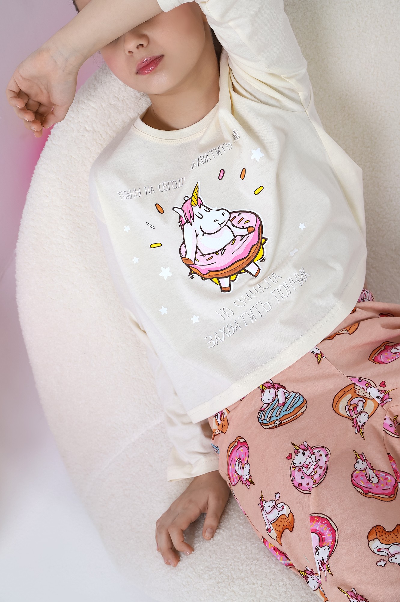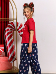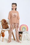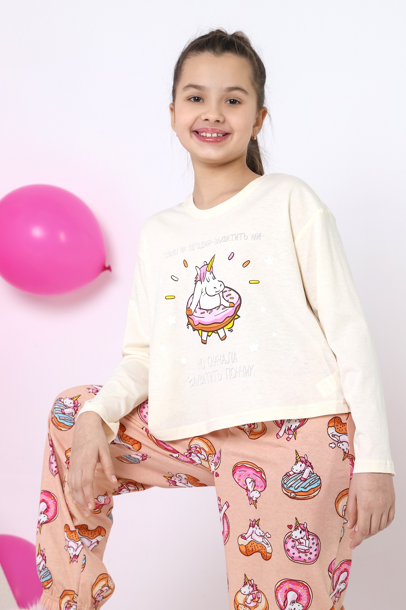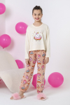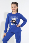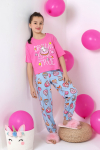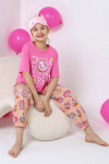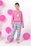 Пижама для девочки из трикотажного полотна "кулирка", состоящая из джемпера и брюк. Джемпер - из гладкокрашеного полотна, слега расширенный и укороченный, с втачными длинными рукавами, горловиной овальной формы, обработанной втачной планкой и принтом в центре переда, выполненным в технике шелкографии. Брюки из полотна с набивным тематическим рисунком, длинные, с эластичной тесьмой по талии и нижним срезами.
