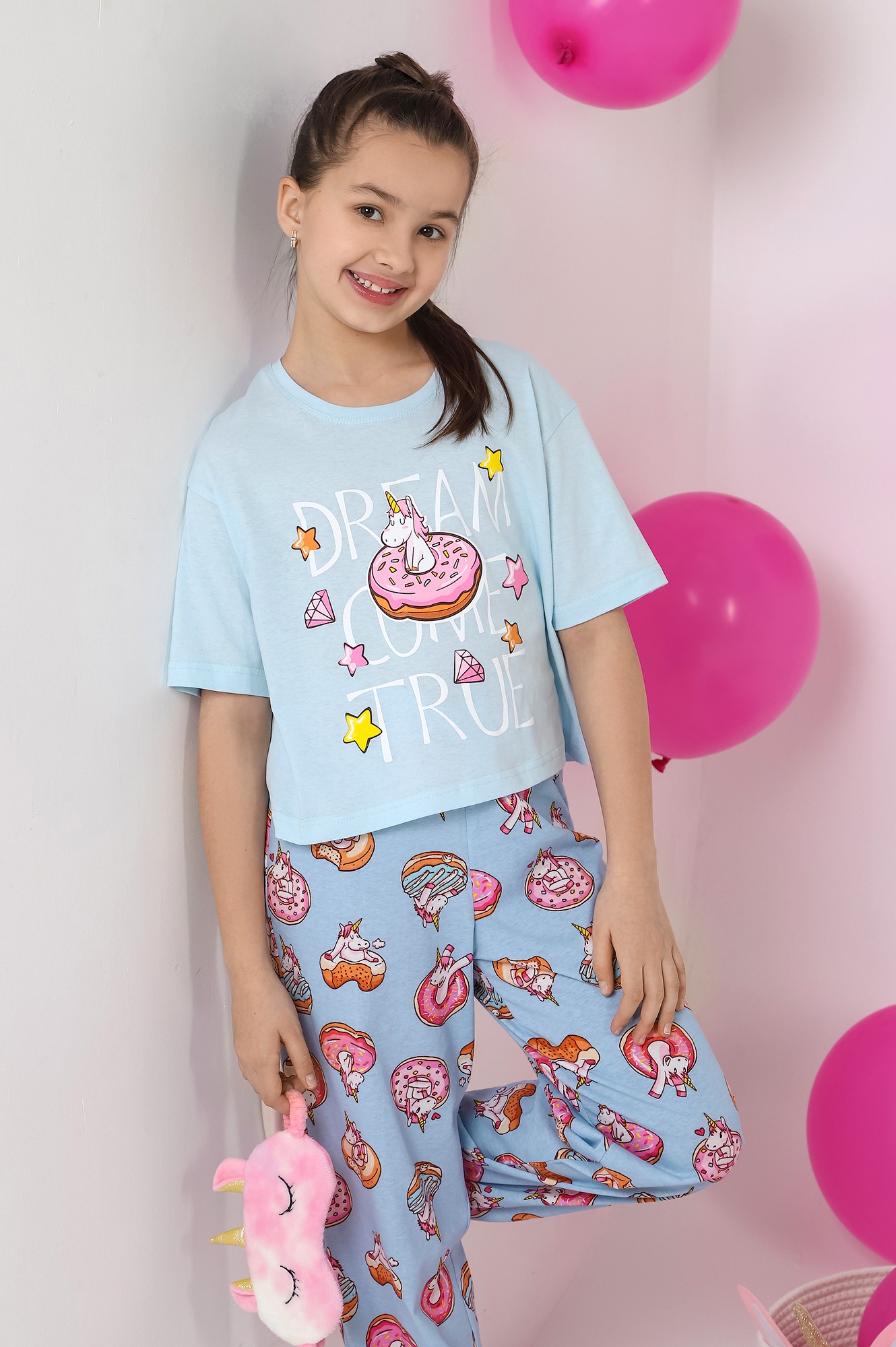 Пижама для девочки из трикотажного полотна "кулирка", состоящая из футболки и брюк. Футболка - из гладкокрашеного полотна, слега расширенная и укороченная, с втачными короткими рукавами, горловиной овальной формы, обработанной втачной планкой и принтом в центре переда, выполненным в технике шелкографии. Брюки из полотна с набивным тематическим рисунком, длинные, с эластичной тесьмой по талии и нижним срезами.
