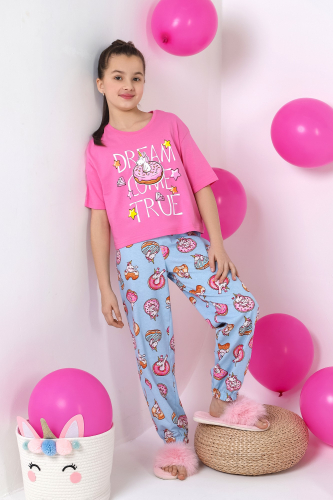 Пижама для девочки из трикотажного полотна "кулирка", состоящая из футболки и брюк. Футболка - из гладкокрашеного полотна, слега расширенная и укороченная, с втачными короткими рукавами, горловиной овальной формы, обработанной втачной планкой и принтом в центре переда, выполненным в технике шелкографии. Брюки из полотна с набивным тематическим рисунком, длинные, с эластичной тесьмой по талии и нижним срезами.