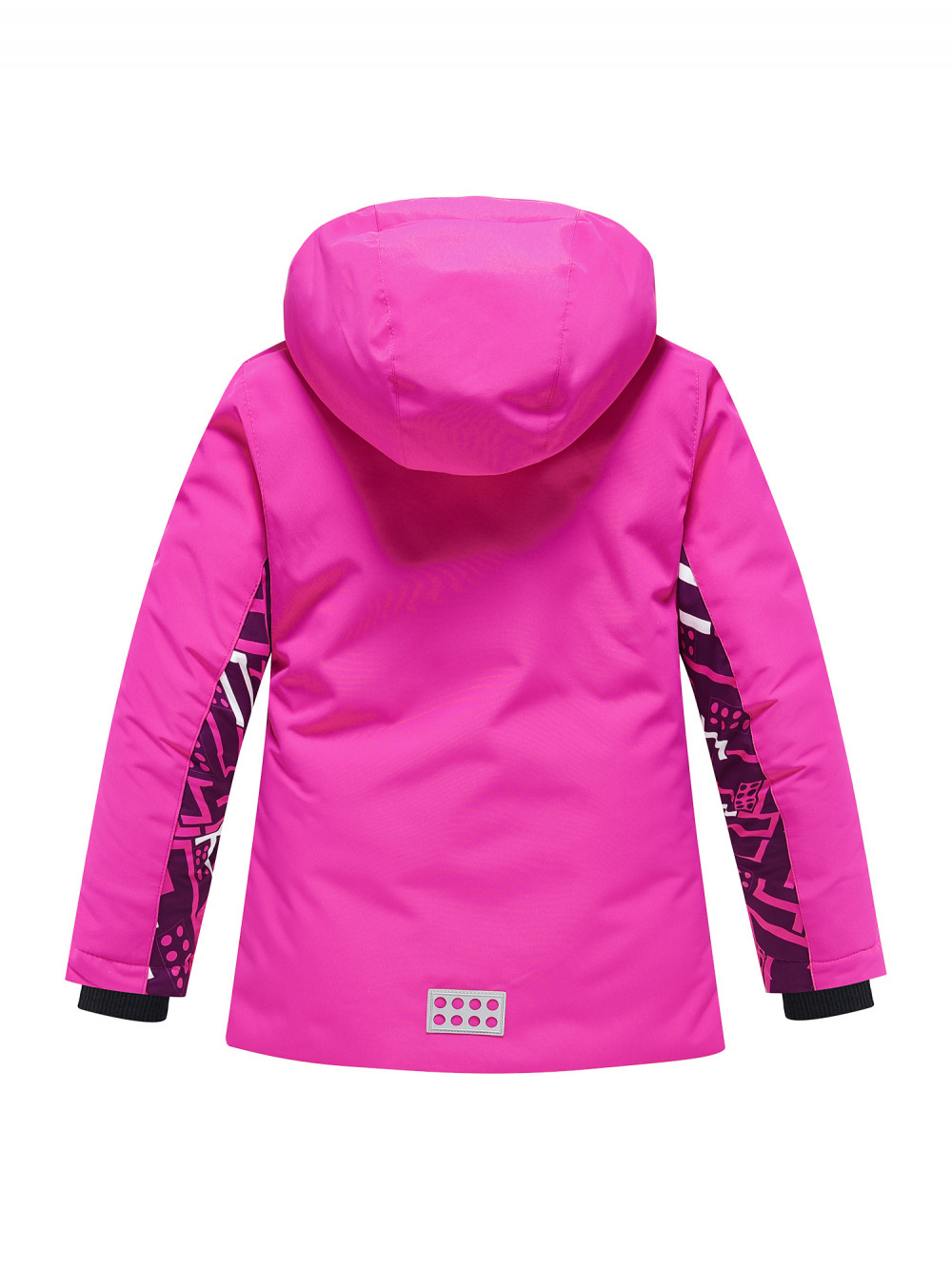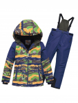 Детский зимний костюм включает в себя куртку прямого кроя с комбинированным дизайном и однотонные горнолыжные брюки.