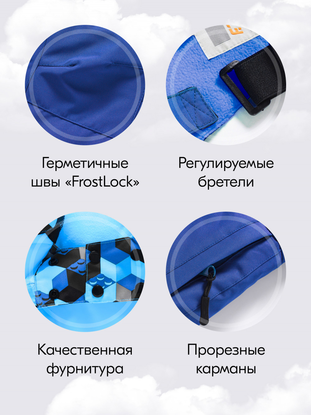 Брюки также продуманы до мелочей: съемные регулируемые бретели обеспечивают надежную посадку, а утепленная спинка гарантирует дополнительный комфорт.