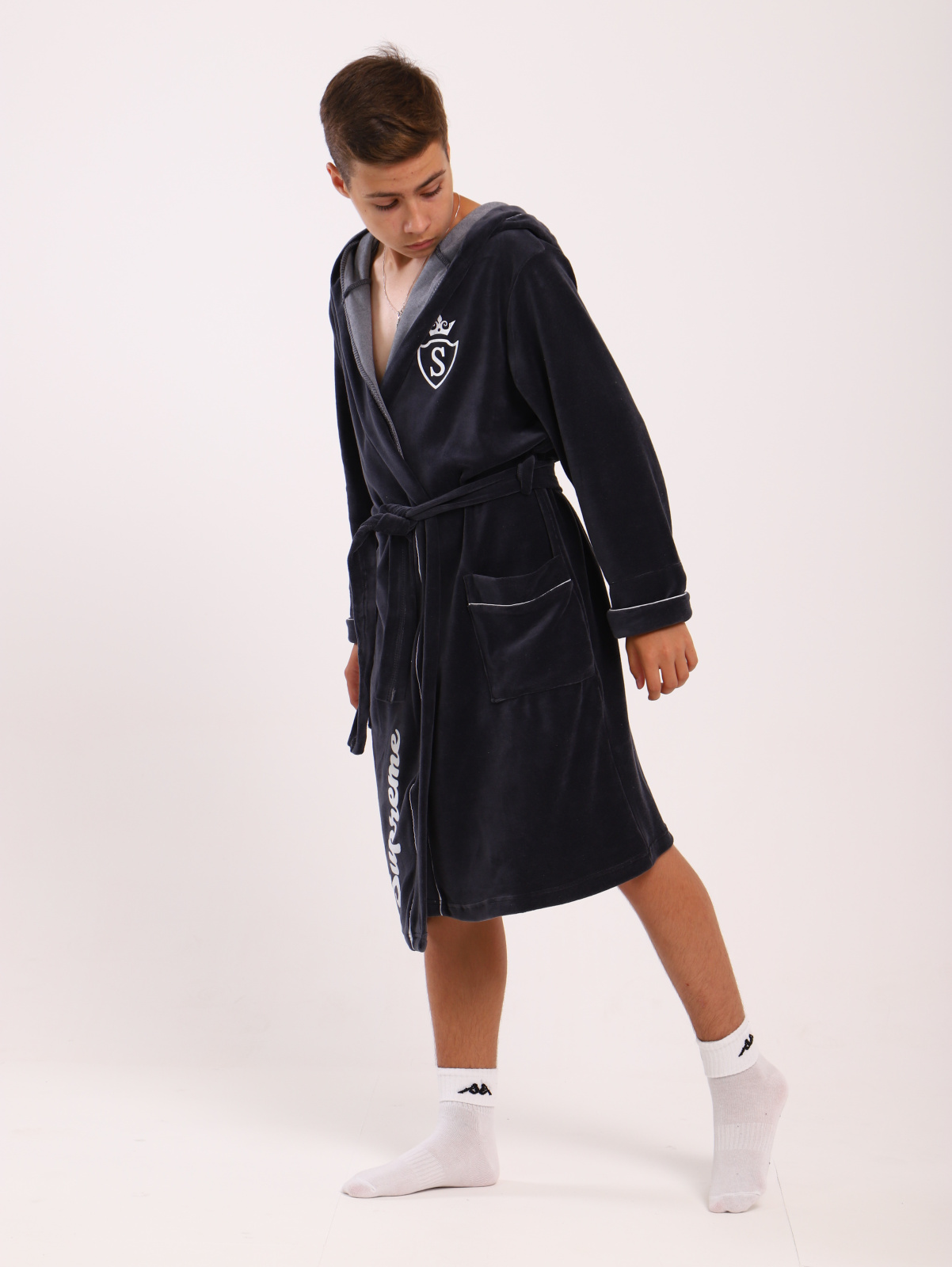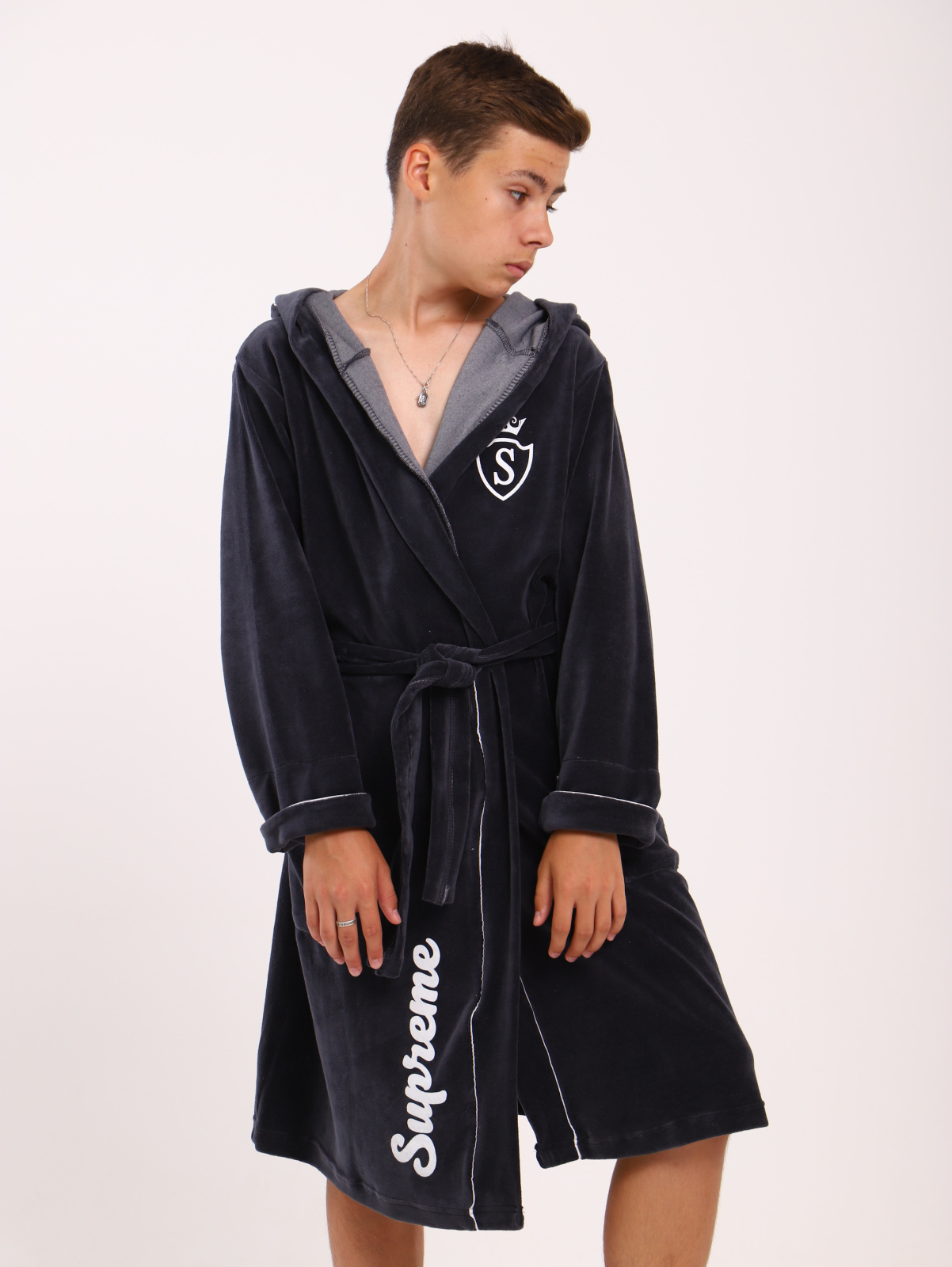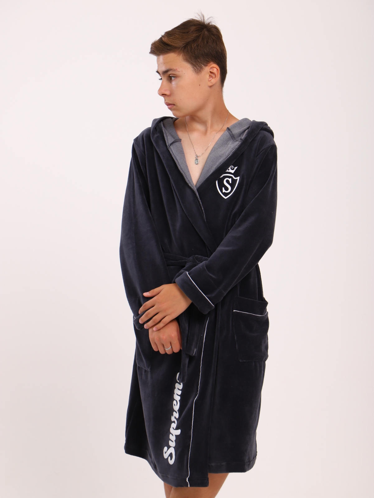 Домашний халат для мальчика отлично согревает в холодное время года, однако при этом дышит. У халата детского из велюра высокая износостойкость. Такой вариант легкий и свободный, практически не ощущается на теле. Халат с большим капюшоном, накладными карманами, длинными рукавами, на запах с поясом. Ужлюная посадка на фигуре подростка гарантирует комфорт. Рекомендуем как домашнюю одежду, как банный халат. Так же можно использовать его для тепла после занятий в бассейне. Размерный ряд: 134,140,146, 152, 158, 164