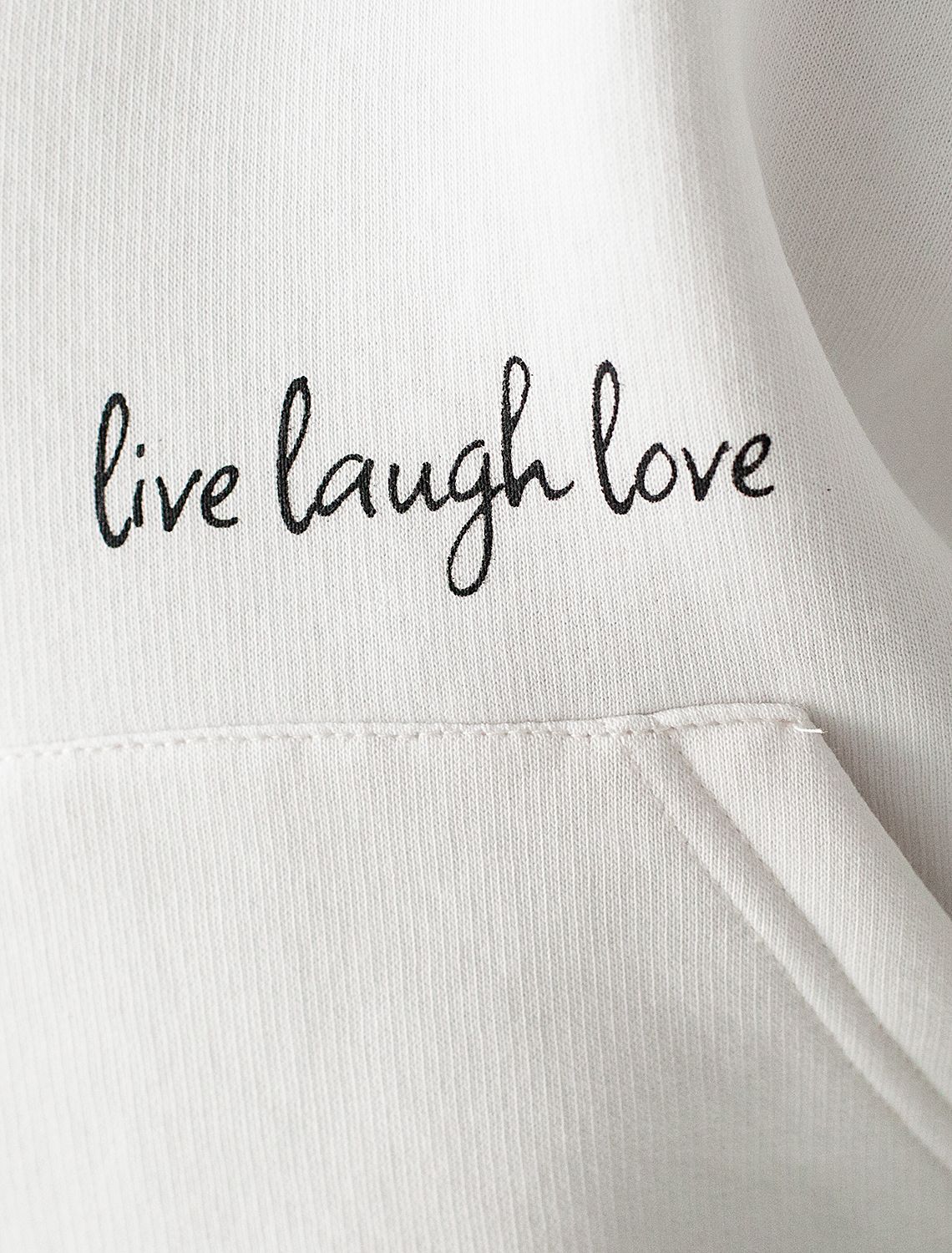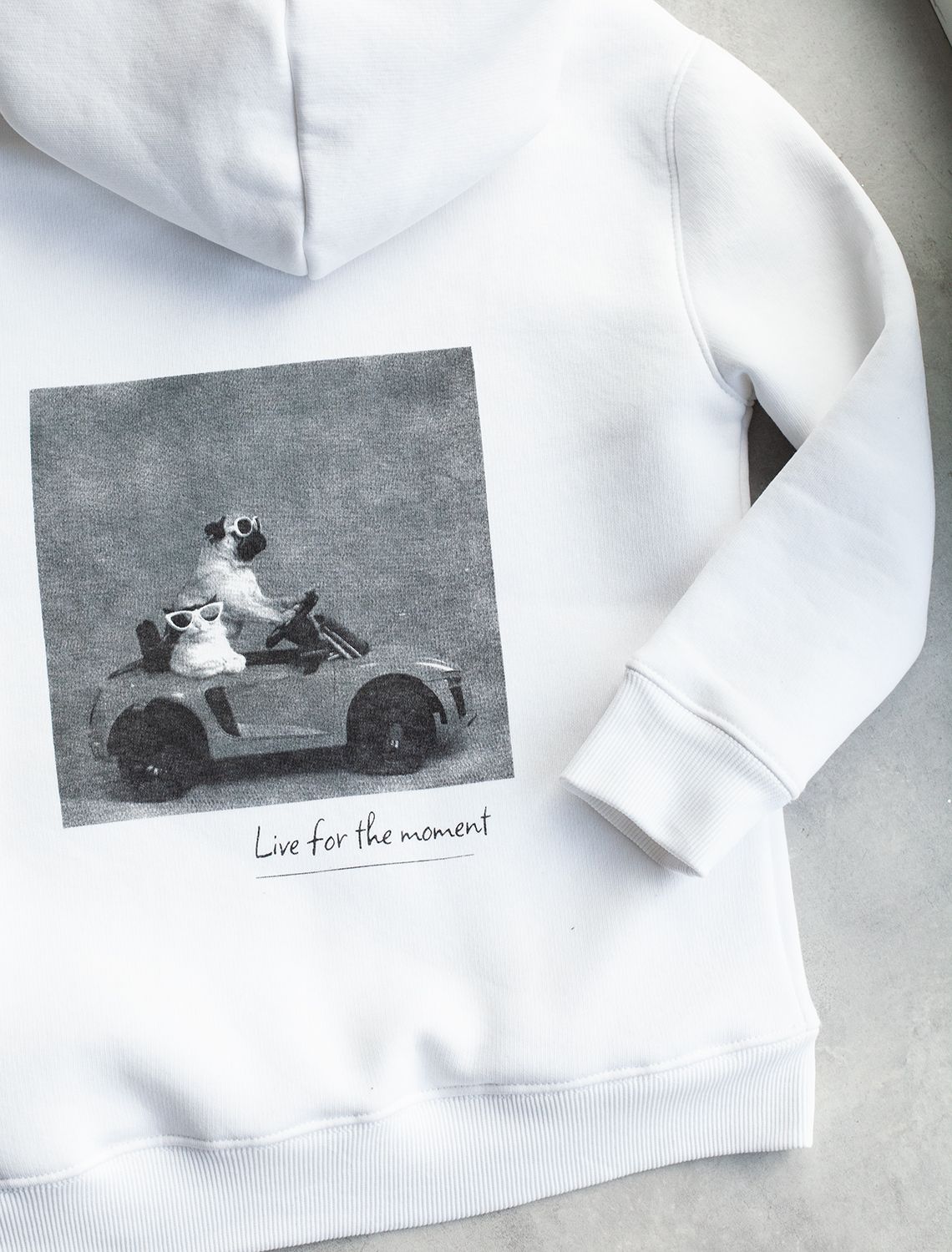 Худи выполнено из футера-трехнитки. Теплая модель с начесом дополнена забавным фотопринтом на спинке и надписью: «Живи в моменте» и «Живи, смейся, люби». Гармонично сочетается в костюме с брюками F44.064