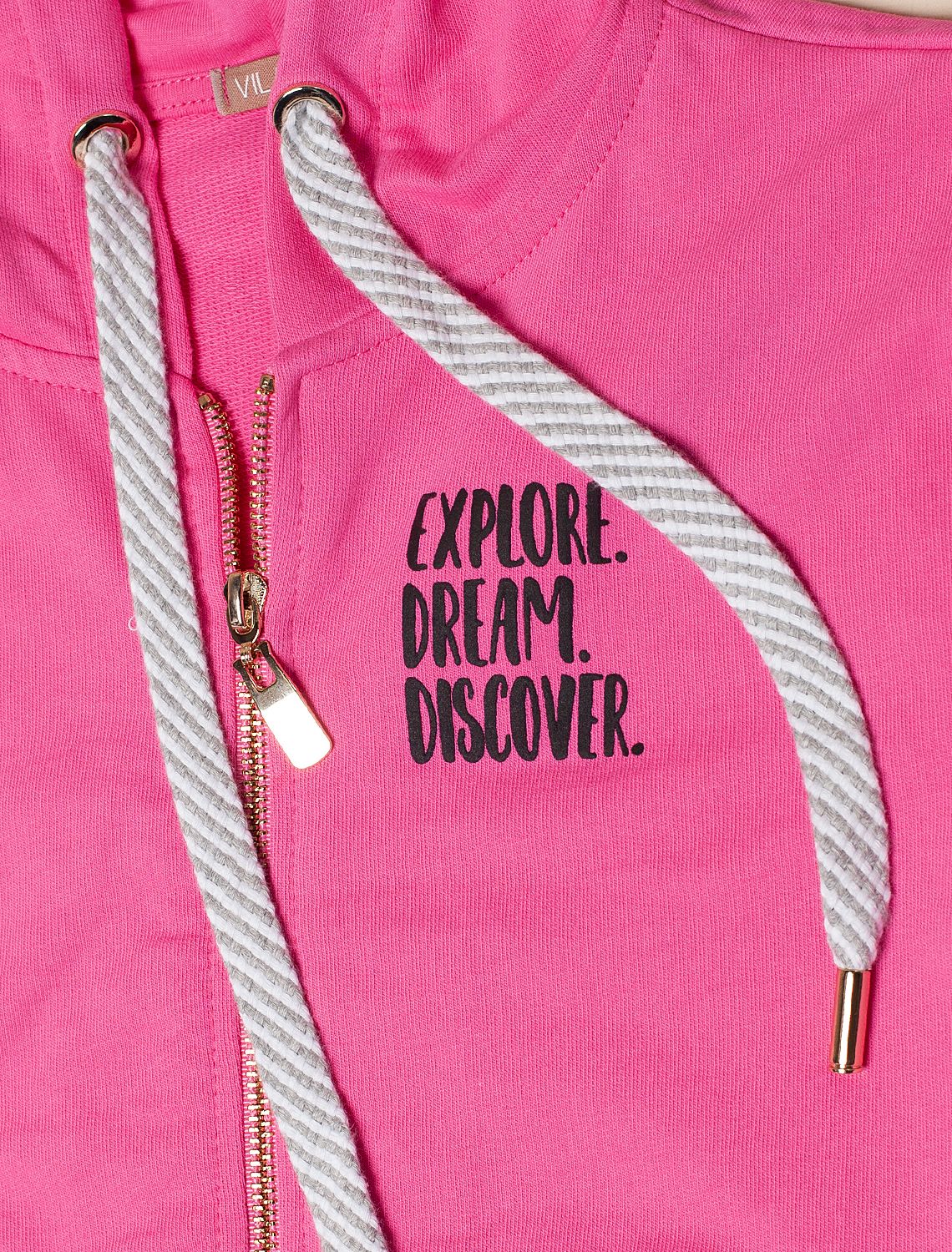 Худи цвета фуксия на молнии с длинными рукавами и спущенной линией плеч сшито из премиального хлопкового футера. Материал отлично поддерживает циркуляцию воздуха, а крой не ограничивает движения. Модель с высококачественной золотистой фурнитурой украшена устойчивым принтом. Идеально в костюме с брюками F44.060