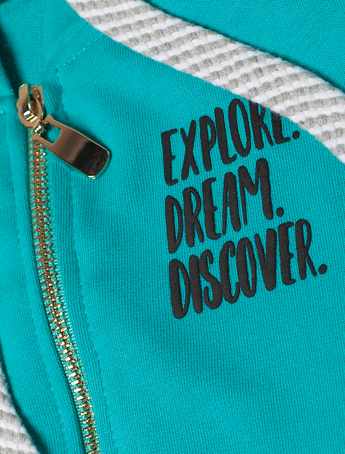 Мятное худи на молнии с длинными рукавами и спущенной линией плеч сшито из премиального хлопкового футера. Материал отлично поддерживает циркуляцию воздуха, а крой не ограничивает движения. Модель с высококачественной золотистой фурнитурой украшена устойчивым принтом. Идеально в костюме с брюками F44.060