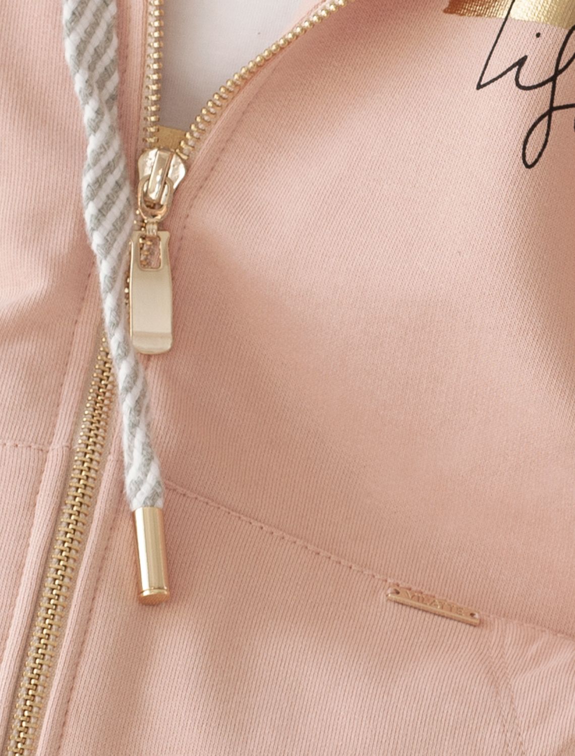 Пудровое худи на молнии с длинными рукавами и спущенной линией плеч сшито из премиального хлопкового футера. Материал отлично поддерживает циркуляцию воздуха, а крой не ограничивает движения. Модель с высококачественной золотистой фурнитурой украшена устойчивым принтом. Идеально в костюме с брюками F44.060