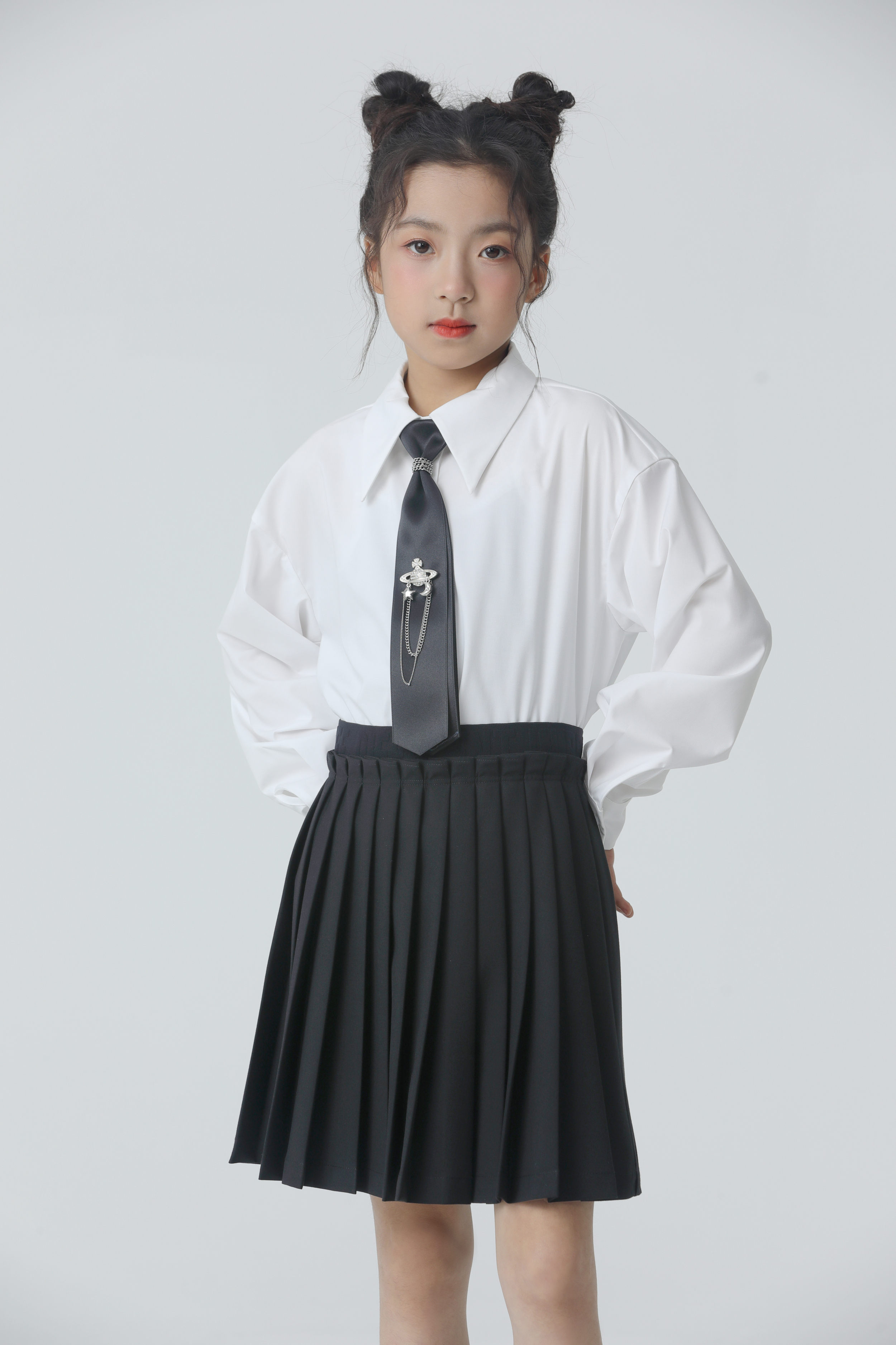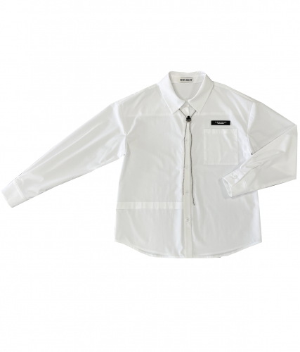 Блузка с длинным рукавом из  премиальной вискозной ткани свободного кроя. Спущенное плечо. Застежка на пуговицы. Галстук черного цвета с металлической брошью на резинке в комплекте.