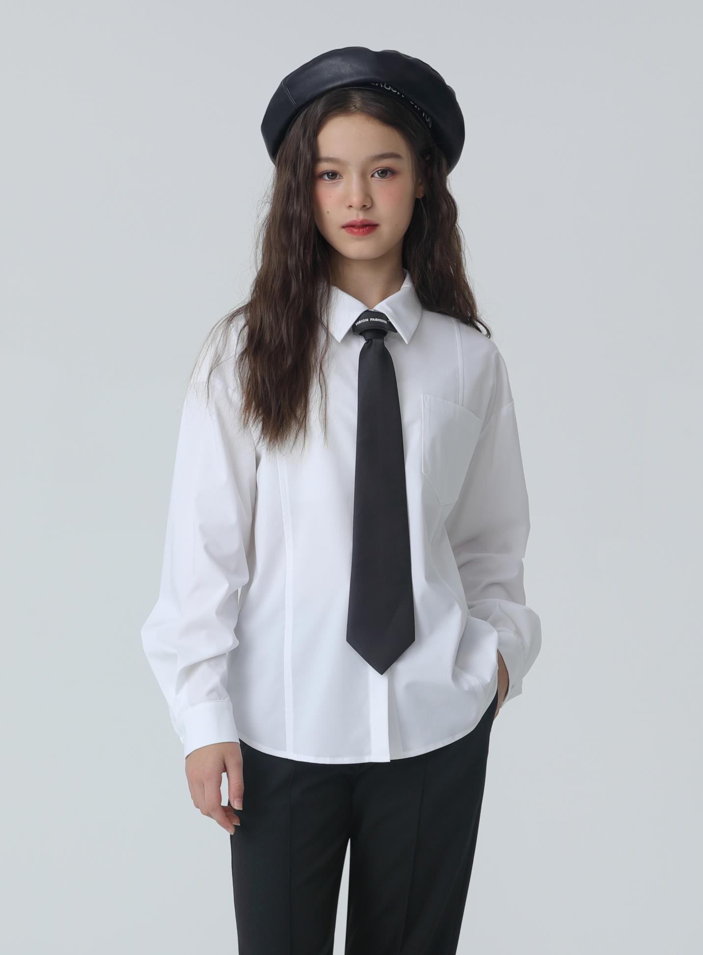 Блузка с длинным рукавом из  премиальной вискозной ткани свободного кроя. Спущенное плечо. Накладной карман. Застежка на пуговицы. Галстук черного цвета с прорезиненной надписью на резинке в комплекте.
