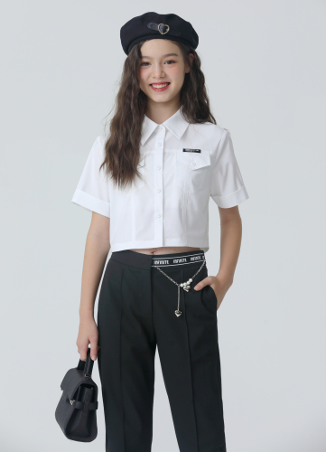 Блузка с коротким рукавом из  премиальной вискозной ткани укороченного  кроя.  Накладные карманы. Застежка на пуговицы. Нашит шеврон.