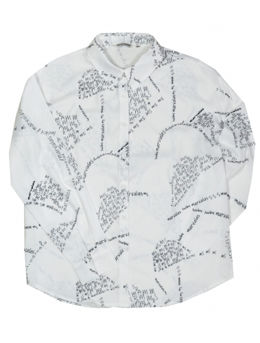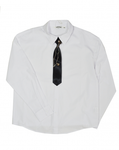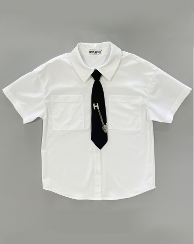 Блузка с коротким рукавом из  премиальной вискозной ткани свободного кроя. Спущенное плечо. Застежка на пуговицы. Галстук черного цвета с металлической брошью на резинке в комплекте. Накладные карманы.