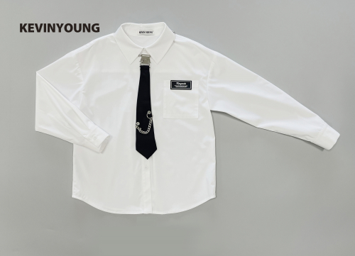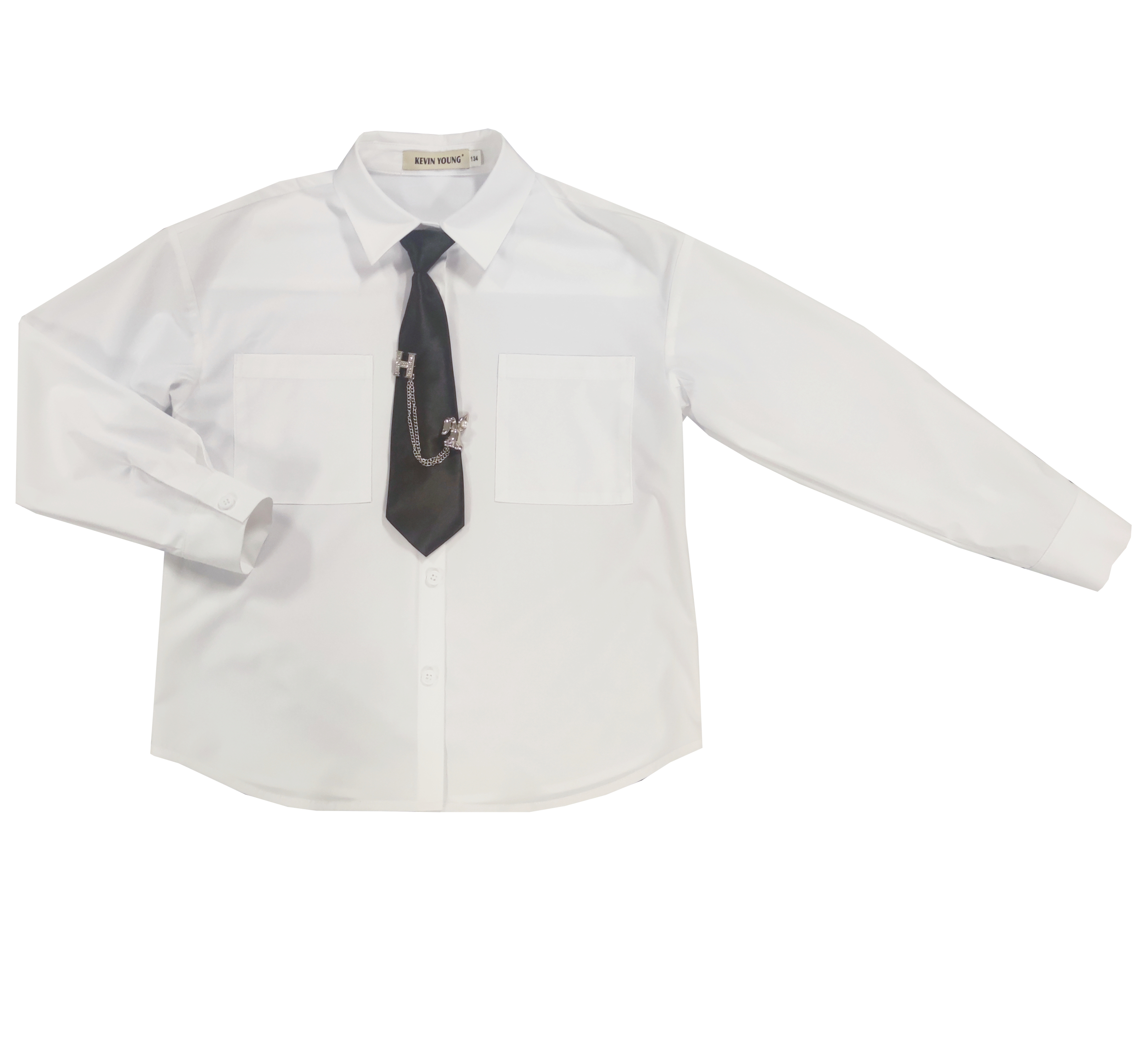 Блузка с длинным рукавом из  премиальной вискозной ткани свободного кроя. Спущенное плечо. Застежка на пуговицы. Накладные карманы. Галстук черного цвета на резинке в комплекте.