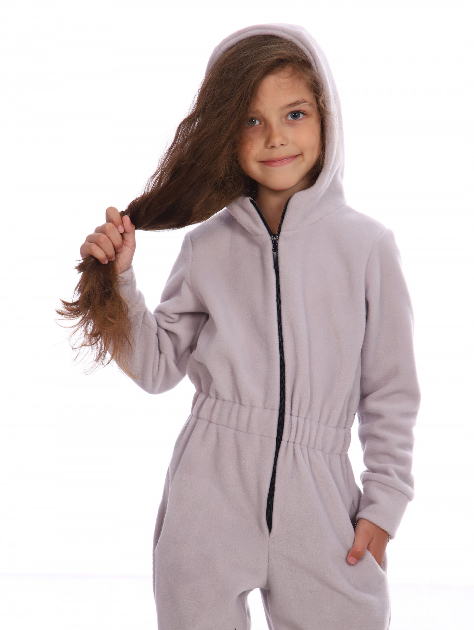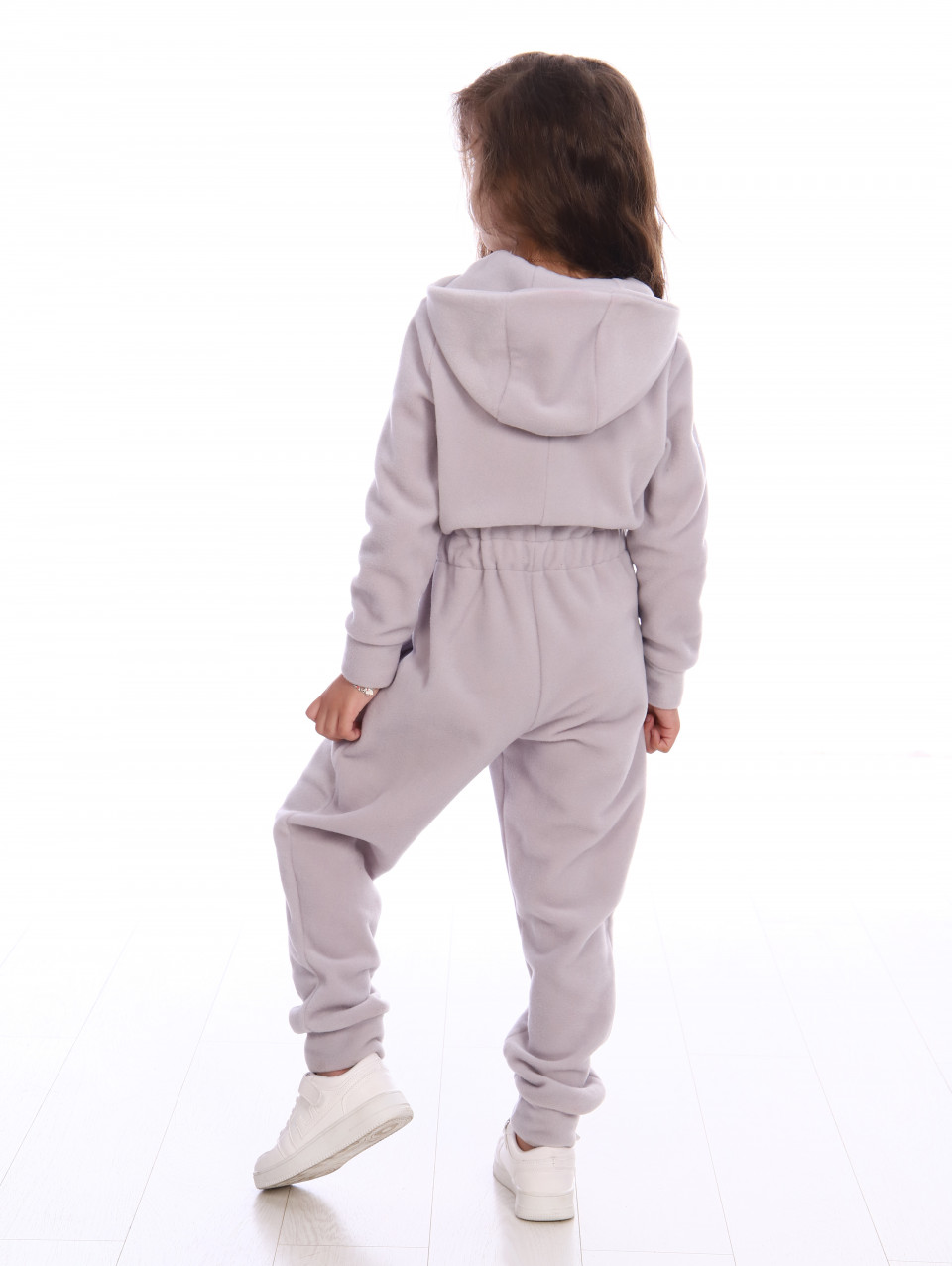 Детский комбинезон из мягкой флисовой ткани. Предназначен для повседневной носки в осенне-зимний период в качестве первого слоя или самостоятельной одежды. Флисовый комбинезон утепленный пригодится для долгих прогулок в путешествии или в парке рядом с домом. Флисовая поддева универсальна, подойдет для мальчика и для девочки, можно использовать как термобелье. Комбинезон застегивается на молнию, есть капюшон. Сзади на поясе вшита резинка-утяжка, рукава и низ штанин оформлены манжетами.