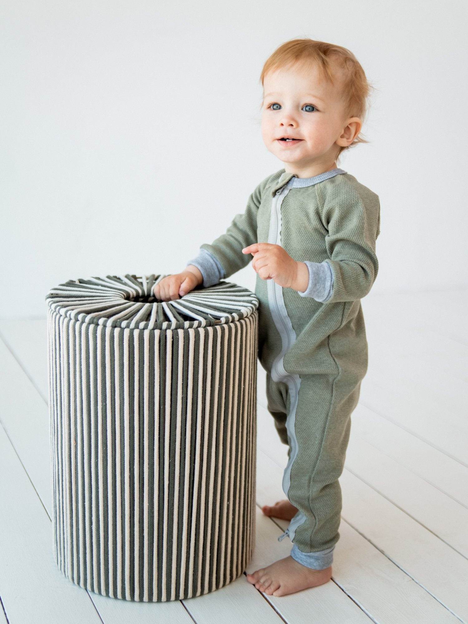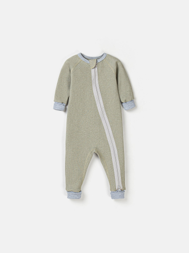 Центральная молния, уходящая в ножку, с защитой от защемления делает переодевание быстрым и безопасным — удобно, если малыш засыпает на прогулке. Двойной бегунок позволяет сменить подгузник, не снимая комбинезон полностью и не потревожив сладкий сон ребенка.