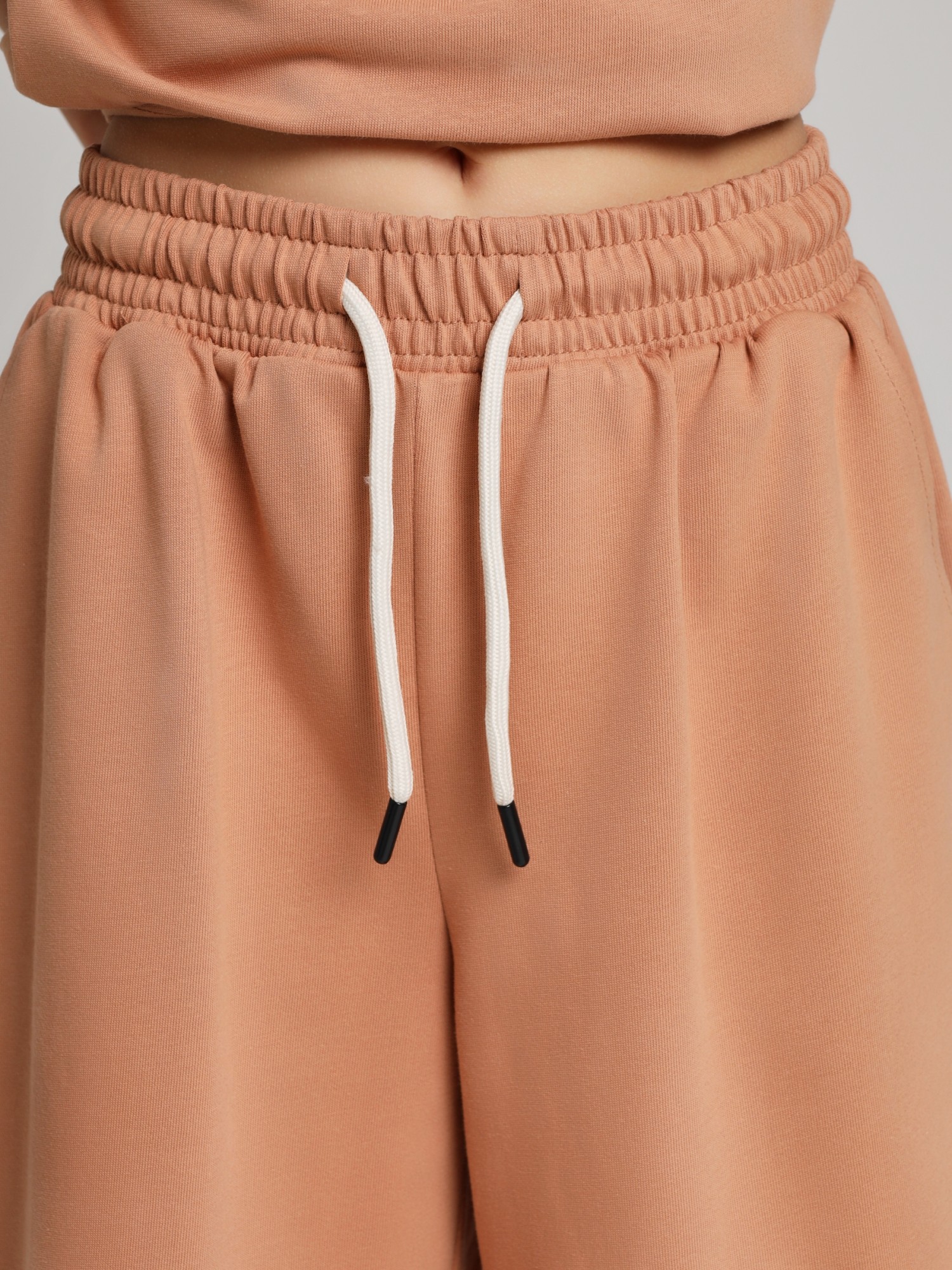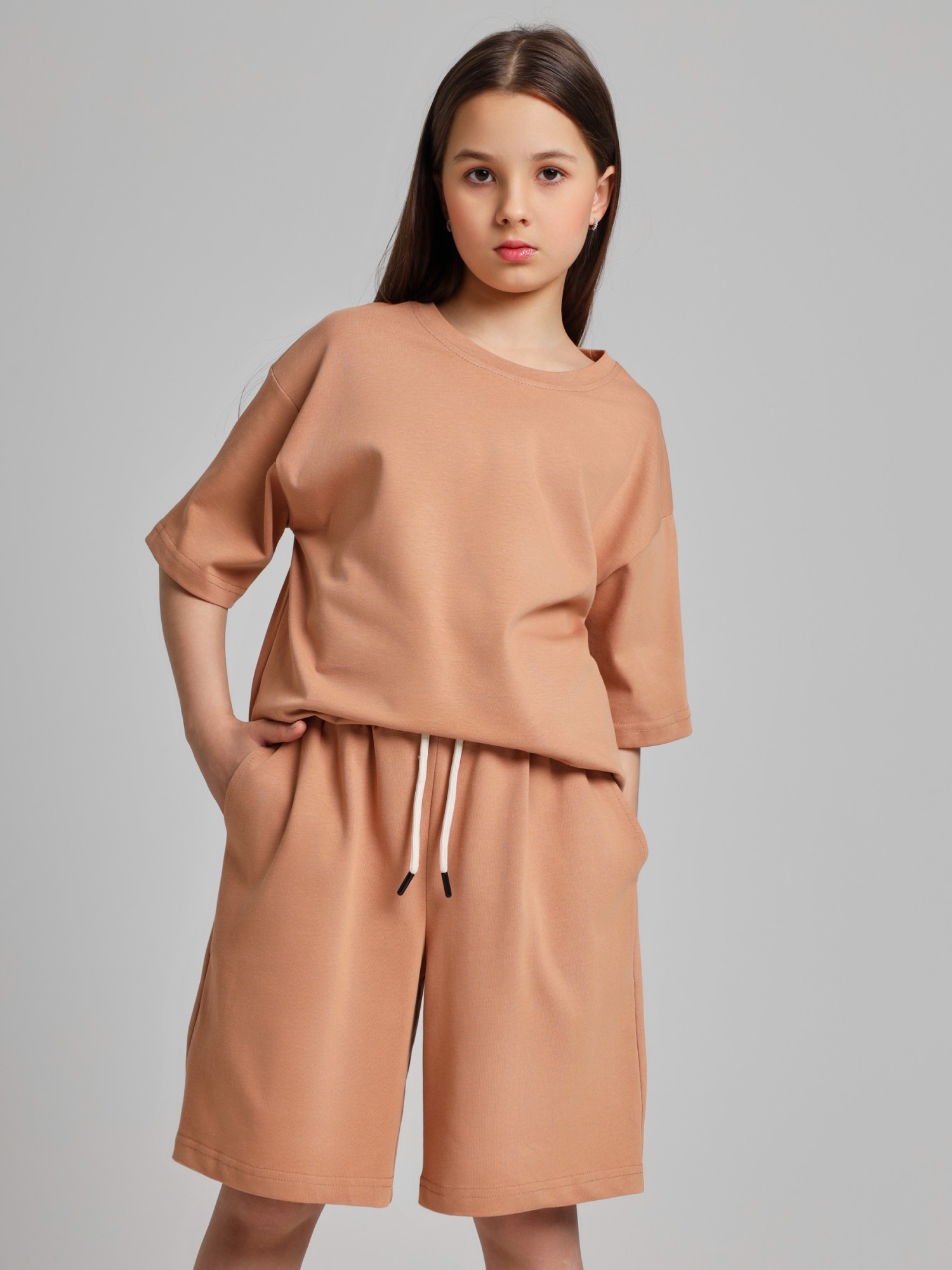 Костюм для девочки из плотного гладкокрашеного трикотажного полотна "кулирка", состоящий из футболки и шорт. Футболка - свободного покроя, с удлиненными плечевым и швами, короткими втачными рукавами и горловиной овальной формы, обработанной втачной планкой. В нижней части переда слева настрочен декоративный элемент прямоугольной формы. По горловине проложена отделочная строчка. Шорты - классического покроя, на притачном поясе с эластичной тесьмой внутри и карманами в боковых швах. Для регулирования степени прилегания шорт по талии в пояс вставлен шнурок, продетый через два отверстия в соединительных швах в центре пояса.