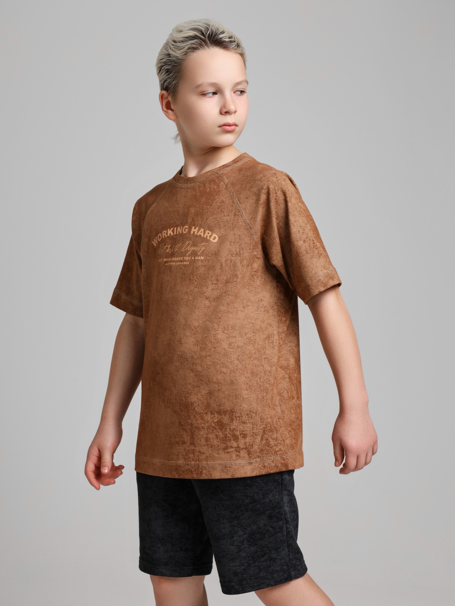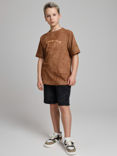 Футболка для мальчика из трикотажного полотна "кулирка-варенка", с короткими рукавами покроя "реглан", горловиной овальной формы, обработанной втачной планкой, и принтом в центре детали переда, выполненным в технике шелкографии. По швам реглана и горловине настрочены отделочные строчки.