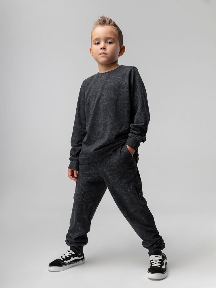 Материал кулирная гладь Состав 92% хлопок 8% лайкра Костюм детский. Свитшот без застежек, округлый вырез горловины, полуприлегающий покрой, брюки-джоггеры, низ на манжетах.