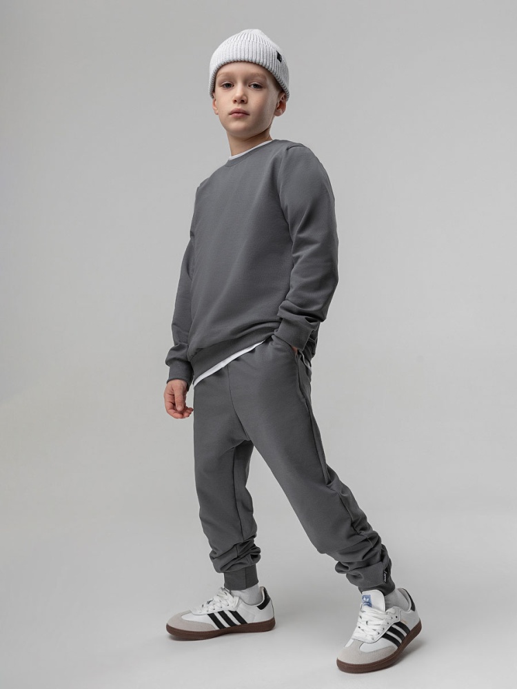 Материал футер двухнитка Состав 92% хлопок 8% лайкра Костюм детский. Свитшот, полуприлегающий покрой, рукава на манжетах, Брюки- джоггеры. Детали: пояс - эластичная резинка, низ изделия- манжеты, карманы с отрезным бочком. Состав: футер двухнитка 92% хлопок 8% лайкра
