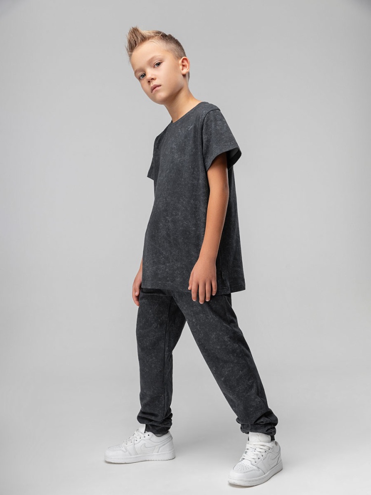 Материал кулирная гладь Состав 92% хлопок 8% лайкра Костюм детский. Футболка: короткие рукава, полуприлегающий покрой, округлый вырез горловины, брюки- джоггеры: пояс - эластичная резинка, низ изделия- манжеты, карманы с отрезным бочком. Состав: кулирная гладь 92% хлопок 8% лайкра
