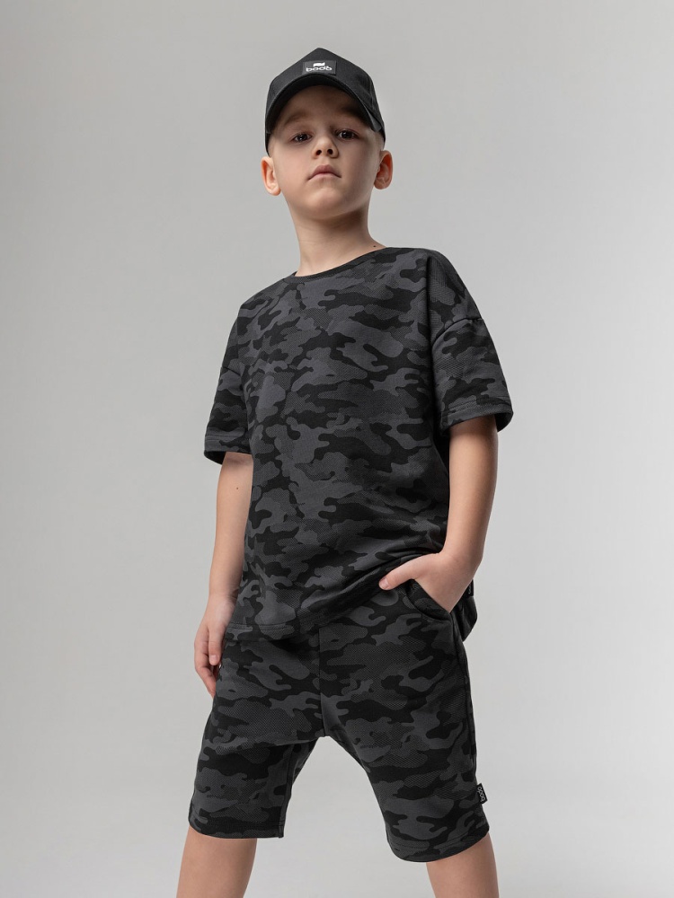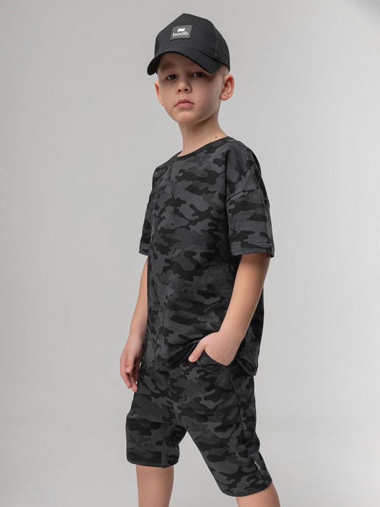 Материал футер двухнитка Состав 92% хлопок 8% лайкра высота упаковки, мм 3 Костюм для детей. Шорты, детали: свободный покрой, пояс - эластичная резинка, карманы с отрезным бочком. Футболка, детали: короткие рукава, свободный покрой, округлый вырез горловины. Состав: футер двухнитка 92% хлопок 8% лайкра