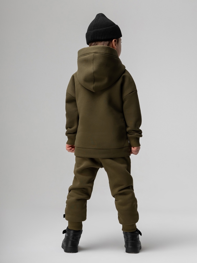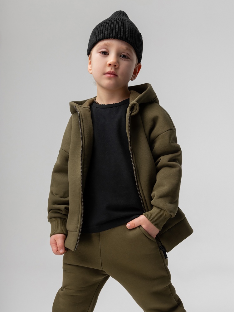 Материал футер трехнитка с начесом Состав 80% хлопок 20% полиэстер Костюм детский. Толстовка: свободный покрой, застежка - молния, рукава на манжетах, защитная планка на молнии, несъемный капюшон, прорезные карманы. Брюки- джоггеры, детали: пояс - эластичная резинка, низ изделия - манжеты, карманы с отрезным бочком. Состав: футер трехнитка с начесом 80% хлопок 20% полиэстер