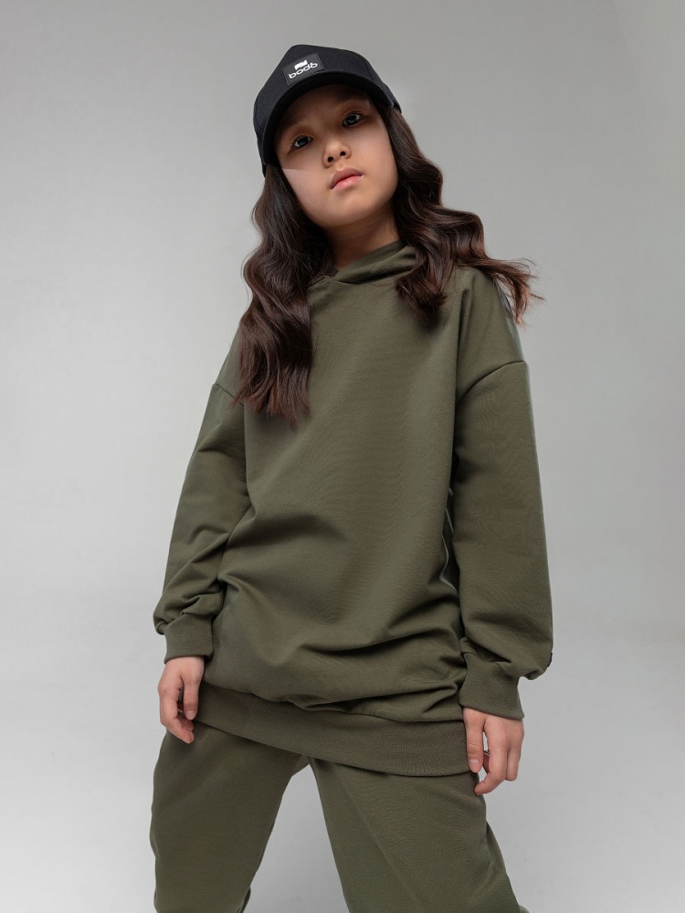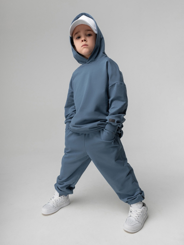 Материал футер двухнитка Состав 92% хлопок 8% лайкра Костюм детский. Толстовка - худи без застежек, свободный покрой, несъемный капюшон, длинный рукав со спущенным плечом. Брюки свободные, низ на манжетах, карманы с отрезным бочком. Состав: футер двухнитка 92% хлопок 8% лайкра
