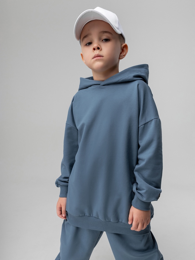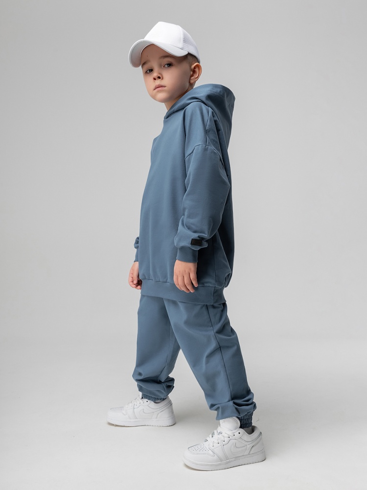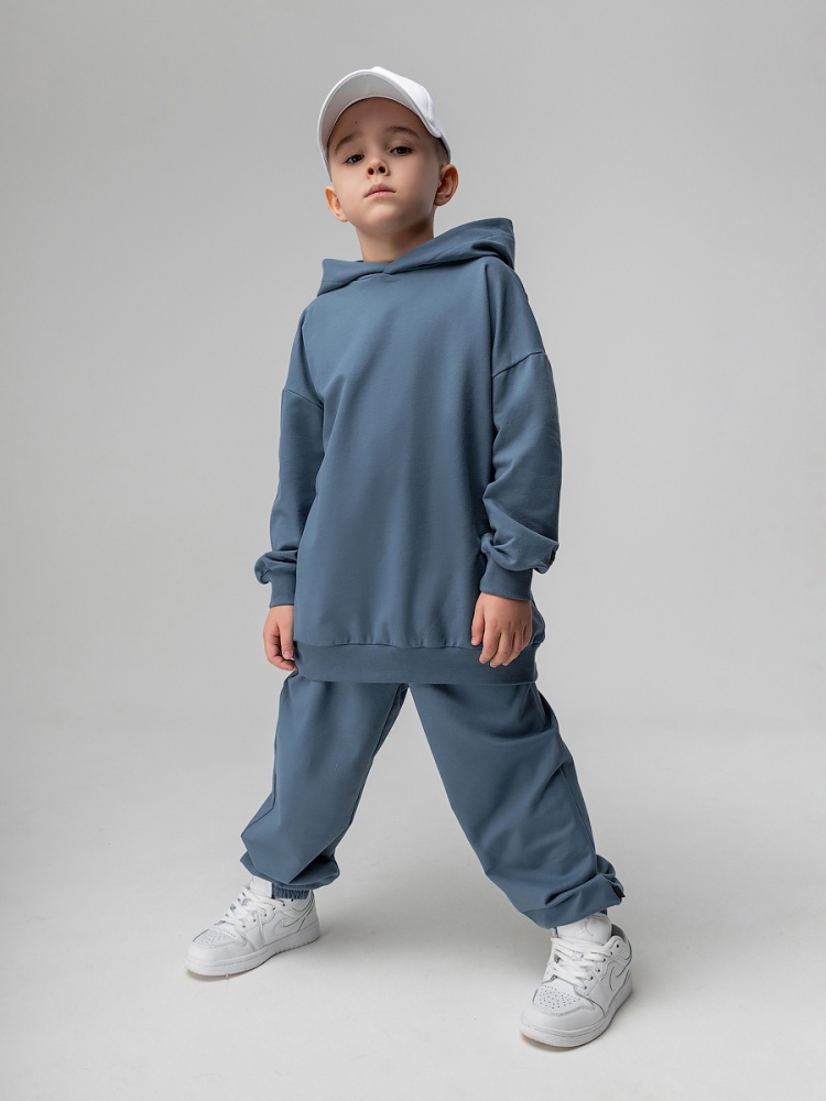 Материал футер двухнитка Состав 92% хлопок 8% лайкра Костюм детский. Толстовка - худи без застежек, свободный покрой, несъемный капюшон, длинный рукав со спущенным плечом. Брюки свободные, низ на манжетах, карманы с отрезным бочком. Состав: футер двухнитка 92% хлопок 8% лайкра