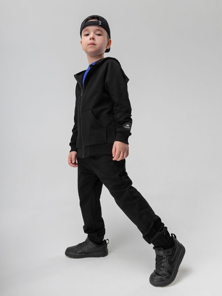 Материал футер двухнитка Состав 92% хлопок 8% лайкра Костюм детский. Толстовка: свободный покрой, застежка - молния, рукава на манжетах, несъемный капюшон, накладные карманы. Брюки- джоггеры, детали: пояс - эластичная резинка, низ изделия - манжеты, карманы с отрезным бочком. Состав: футер двухнитка 92% хлопок 8% лайкра
