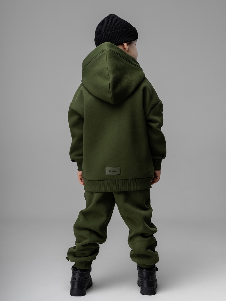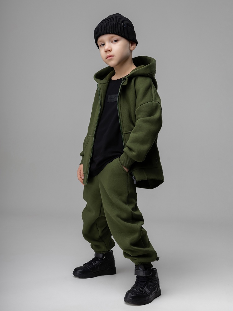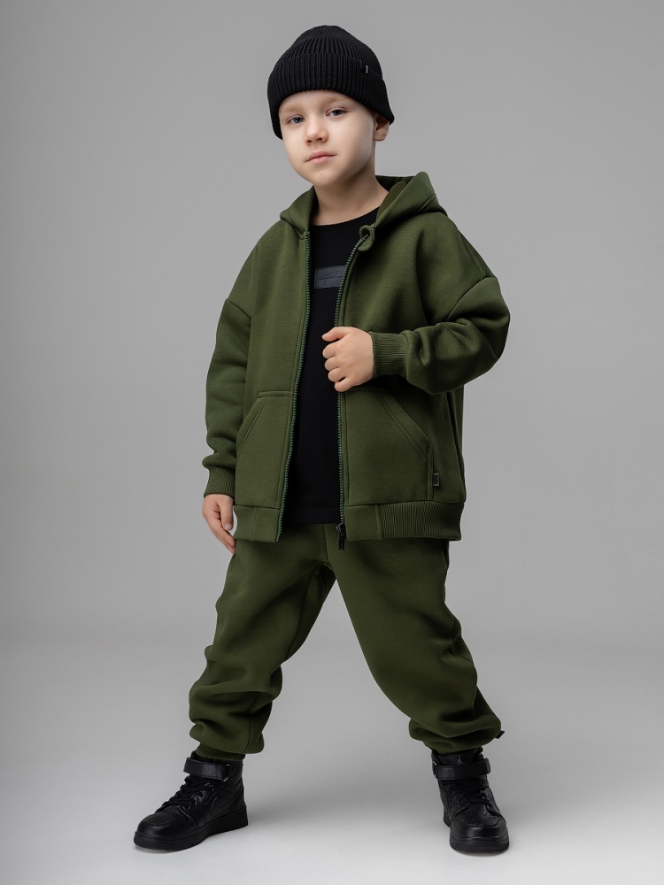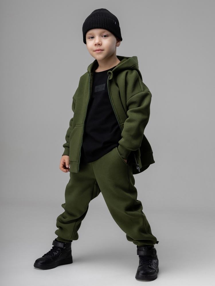 Материал футер трехнитка с начесом Состав 80% хлопок 20% полиэстер Костюм для детей дошкольного возраста. Толстовка прямого силуэта, с центральной бортовой застёжкой на тесьму молния, на притачном поясе по низу изделия, со спущенным плечом, с втачными рукавами с притачной манжетой, с втачным капюшоном. На полочке располагается карман «кенгуру».Брюки прямые свободные на притачном поясе с внутренней резинкой, на притачной манжете. Брюки с боковыми карманами. Без накладного кармана.
