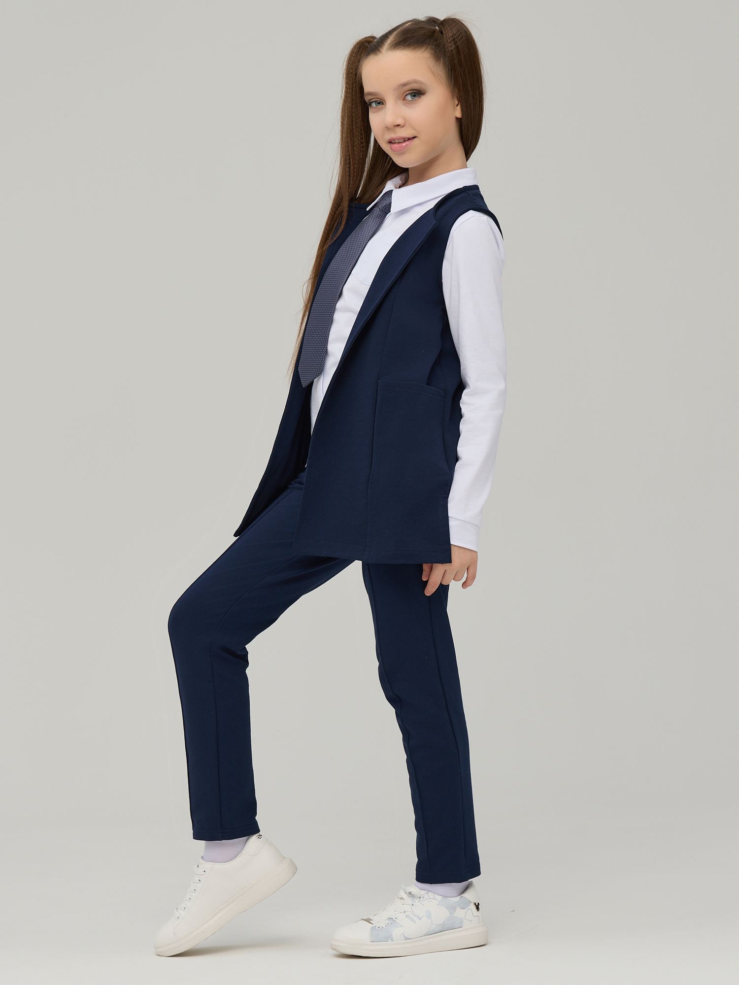 Школьный костюм из футера темно-синего цвета для девочки , состоит из жилета и брюк. Жилет без застежки, с боковыми разрезами и боковыми карманами. Длиной до середины бедра. Брюки зауженные с боковыми карманами. Спереди - отделка в виде застроченной стрелки. Пояс на удобной эластичной резинке. Изделие выполнено из трикотажа премиального качества - ПЕНЬЕ, с содержанием хлопка более 92%