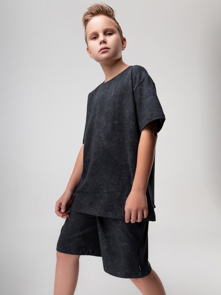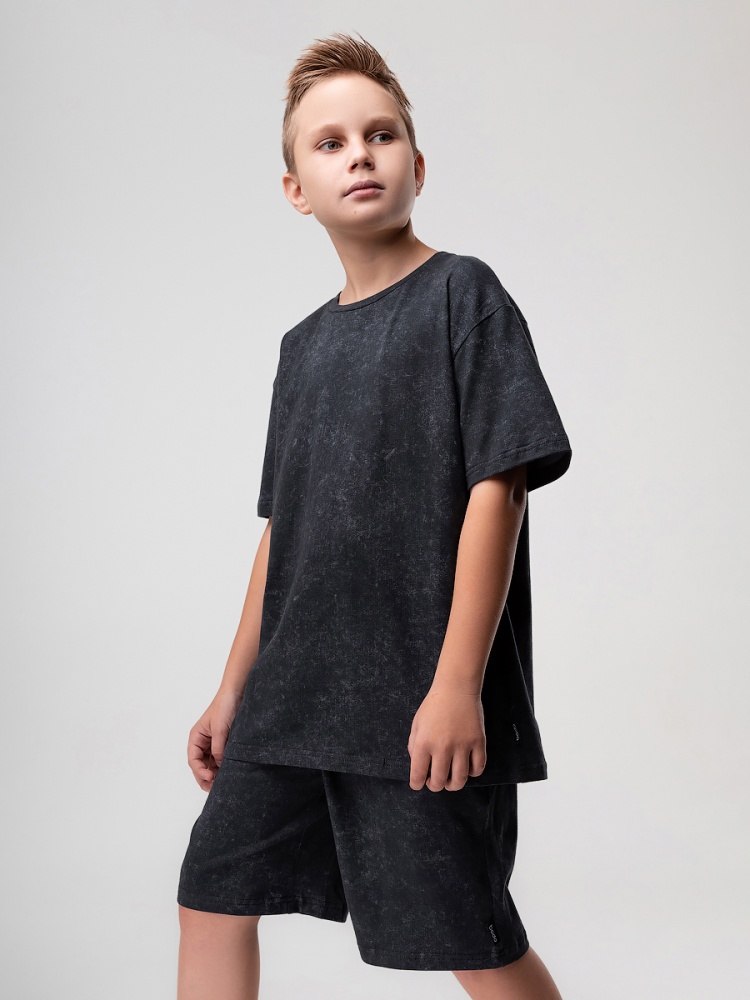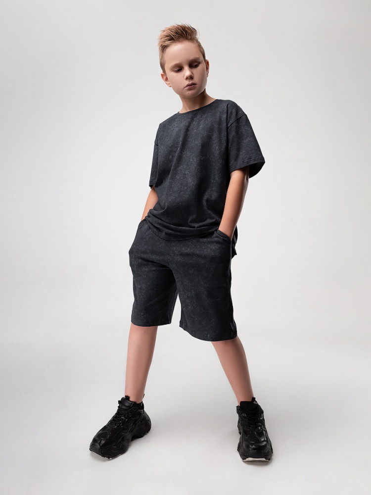 Материал кулирная гладь Состав 92% хлопок 8% лайкра Костюм для детей и подростков. Шорты, детали: свободный покрой, пояс - эластичная резинка, карманы с отрезным бочком. Футболка, детали: короткие рукава, свободный покрой, округлый вырез горловины. Состав: кулирная гладь 92% хлопок 8% лайкра
