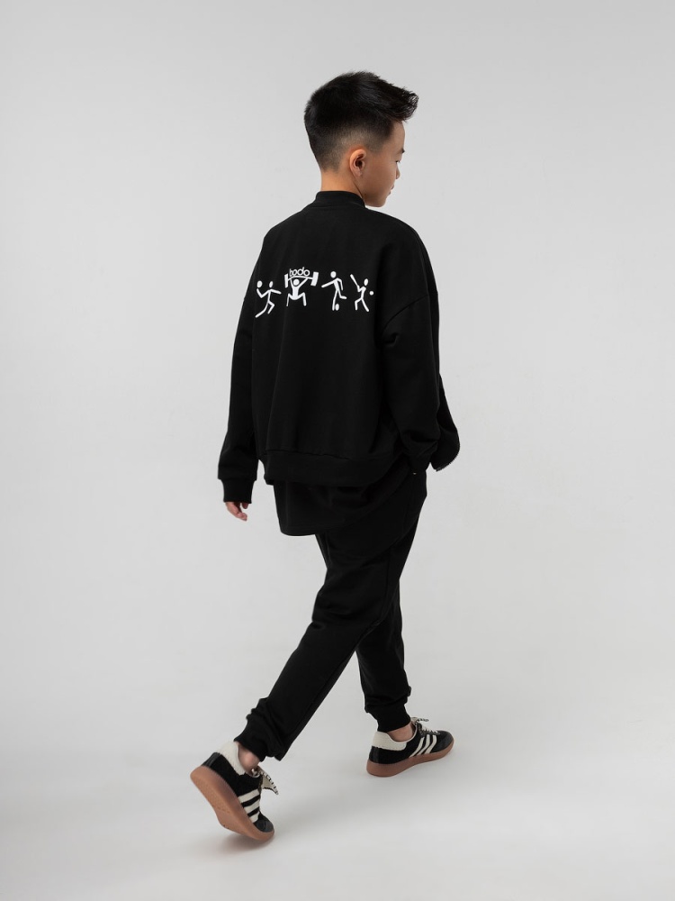Материал футер двухнитка Состав 92% хлопок 8% лайкра Базовый костюм: толстовка и брюки. Толстовка на молнии со спущенным плечом, длинный рукав на манжете. На спинке принт "человечки". Прямы брюки с боковыми карманами на резинке.