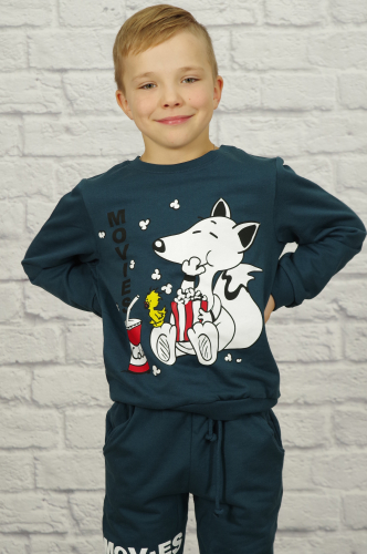 Удобный тёплый костюм для детей из высококачественного хлопка. Толстовку украшает забавный анимационный принт, низ изделия и рукава на эластичном манжете, горловина отделана рибаной. Брюки  с карманами и принтом, штанины снизу на манжете, пояс на резинке со шнурком. Модель не сковывает движения. В этом костюме вашему ребёнку будет удобно и комфортно и на улице, и дома.