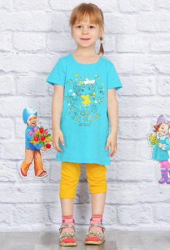 Удобный хлопковый костюм для девочек, который выручит в любой ситуации. В нём будет комфортно и дома и на прогулке. Туника с печатным рисунком и эластичные бриджи, с поясом на резинке.